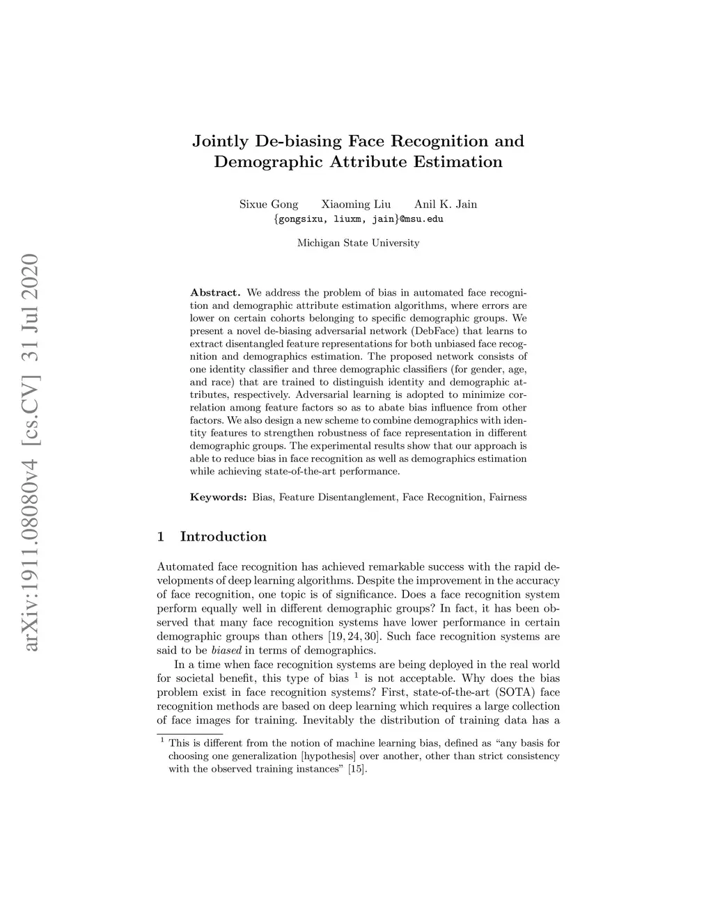 We address the problem of bias in automated face recognition and demographic attribute estimation algorithms, where errors are lower on certain cohorts belonging to specific demographic groups. We present a novel de-biasing adversarial network that learns to extract disentangled feature representations for both unbiased face recognition and demographics estimation. The proposed network consists of one identity classifier and three demographic classifiers (for gender, age, and race) that are trained to distinguish identity and demographic attributes, respectively. Adversarial learning is adopted to minimize correlation among feature factors so as to abate bias influence from other factors. We also design a new scheme to combine demographics with identity features to strengthen robustness of face representation in different demographic groups. The experimental results show that our approach is able to reduce bias in face recognition as well as demographics estimation while achieving state-of-the-art performance.