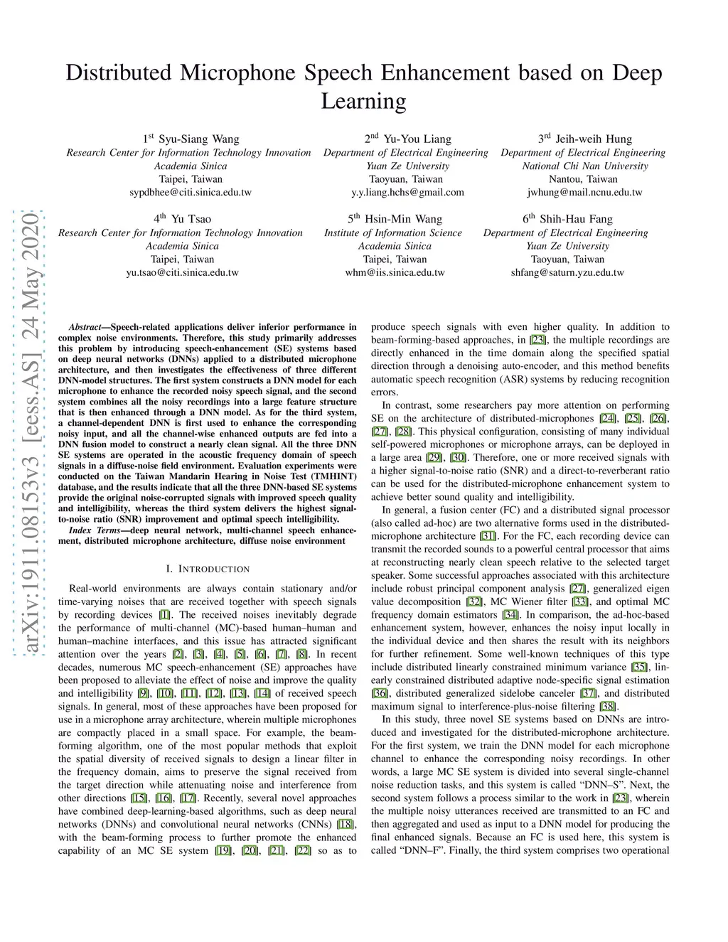 Speech-related applications deliver inferior performance in complex noise environments. Therefore, this study primarily addresses this problem by introducing speech-enhancement (SE) systems based on deep neural networks (DNNs) applied to a distributed microphone architecture, and then investigates the effectiveness of three different DNN-model structures. The first system constructs a DNN model for each microphone to enhance the recorded noisy speech signal, and the second system combines all the noisy recordings into a large feature structure that is then enhanced through a DNN model. As for the third system, a channel-dependent DNN is first used to enhance the corresponding noisy input, and all the channel-wise enhanced outputs are fed into a DNN fusion model to construct a nearly clean signal. All the three DNN SE systems are operated in the acoustic frequency domain of speech signals in a diffuse-noise field environment. Evaluation experiments were conducted on the Taiwan Mandarin Hearing in Noise Test (TMHINT) database, and the results indicate that all the three DNN-based SE systems provide the original noise-corrupted signals with improved speech quality and intelligibility, whereas the third system delivers the highest signal-to-noise ratio (SNR) improvement and optimal speech intelligibility.