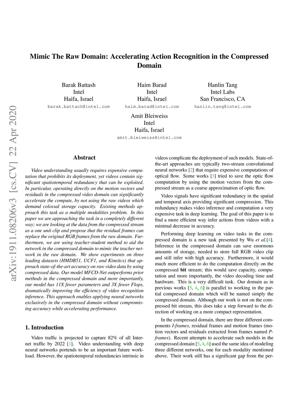 Video understanding usually requires expensive computation that prohibits its deployment, yet videos contain significant spatiotemporal redundancy that can be exploited. In particular, operating directly on the motion vectors and residuals in the compressed video domain can significantly accelerate the compute, by not using the raw videos which demand colossal storage capacity. Existing methods approach this task as a multiple modalities problem. In this paper we are approaching the task in a completely different way; we are looking at the data from the compressed stream as a one unit clip and propose that the residual frames can replace the original RGB frames from the raw domain. Furthermore, we are using teacher-student method to aid the network in the compressed domain to mimic the teacher network in the raw domain. We show experiments on three leading datasets (HMDB51, UCF1, and Kinetics) that approach state-of-the-art accuracy on raw video data by using compressed data. Our model MFCD-Net outperforms prior methods in the compressed domain and more importantly, our model has 11X fewer parameters and 3X fewer Flops, dramatically improving the efficiency of video recognition inference. This approach enables applying neural networks exclusively in the compressed domain without compromising accuracy while accelerating performance.