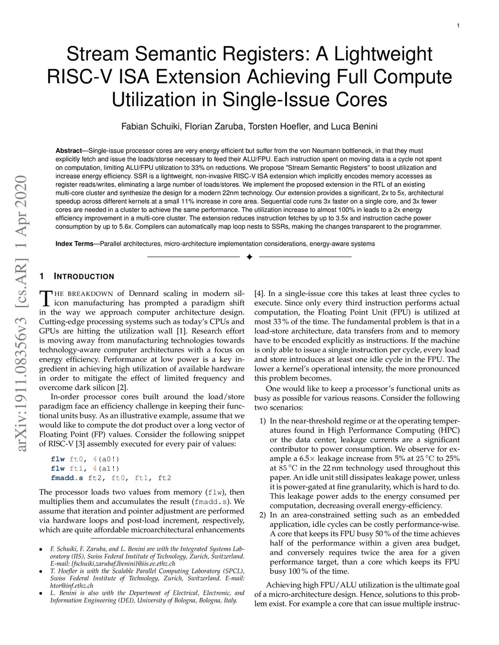Stream Semantic Registers: A Lightweight RISC-V ISA Extension Achieving