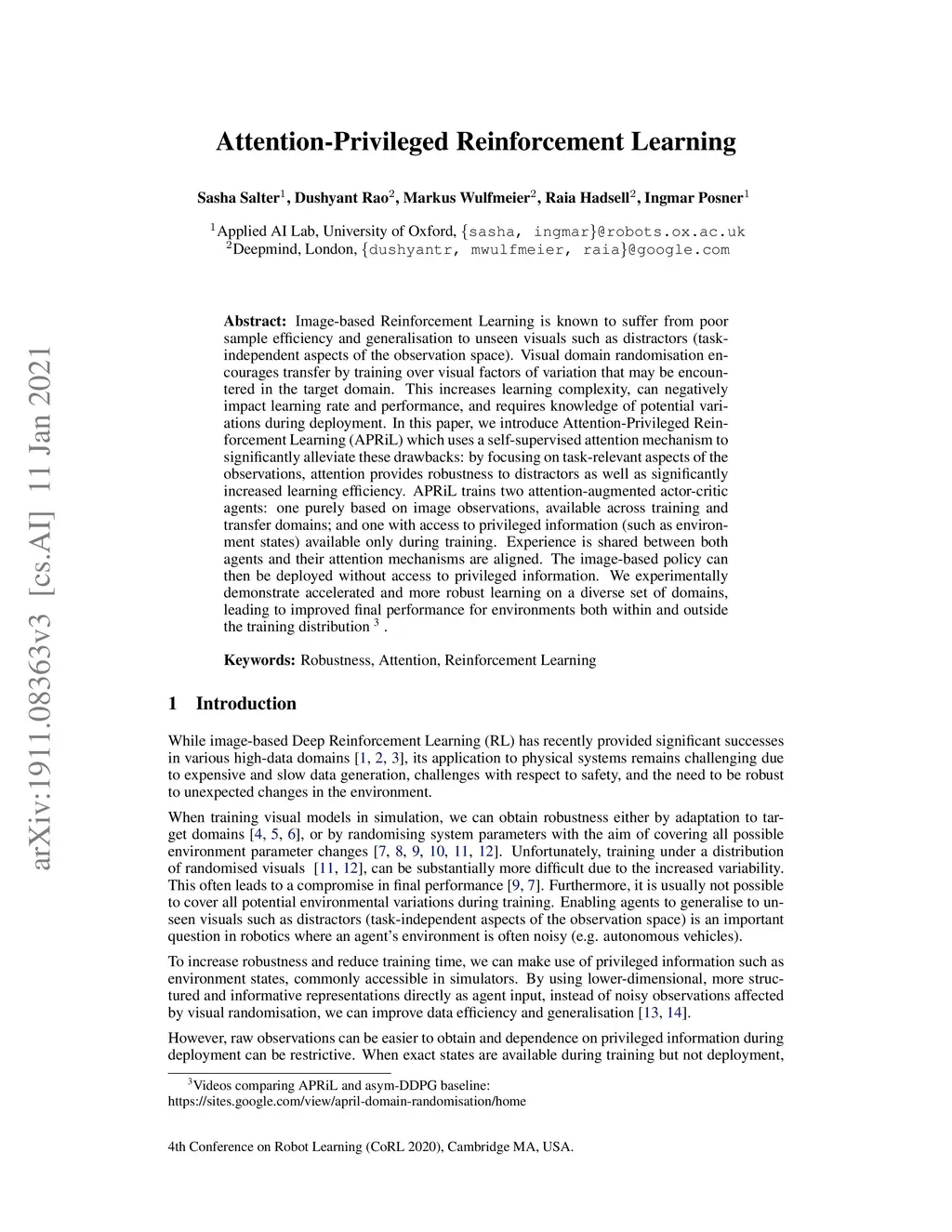 Image-based Reinforcement Learning is known to suffer from poor sample efficiency and generalisation to unseen visuals such as distractors (task-independent aspects of the observation space). Visual domain randomisation encourages transfer by training over visual factors of variation that may be encountered in the target domain. This increases learning complexity, can negatively impact learning rate and performance, and requires knowledge of potential variations during deployment. In this paper, we introduce Attention-Privileged Reinforcement Learning (APRiL) which uses a self-supervised attention mechanism to significantly alleviate these drawbacks: by focusing on task-relevant aspects of the observations, attention provides robustness to distractors as well as significantly increased learning efficiency. APRiL trains two attention-augmented actor-critic agents: one purely based on image observations, available across training and transfer domains; and one with access to privileged information (such as environment states) available only during training. Experience is shared between both agents and their attention mechanisms are aligned. The image-based policy can then be deployed without access to privileged information. We experimentally demonstrate accelerated and more robust learning on a diverse set of domains, leading to improved final performance for environments both within and outside the training distribution.