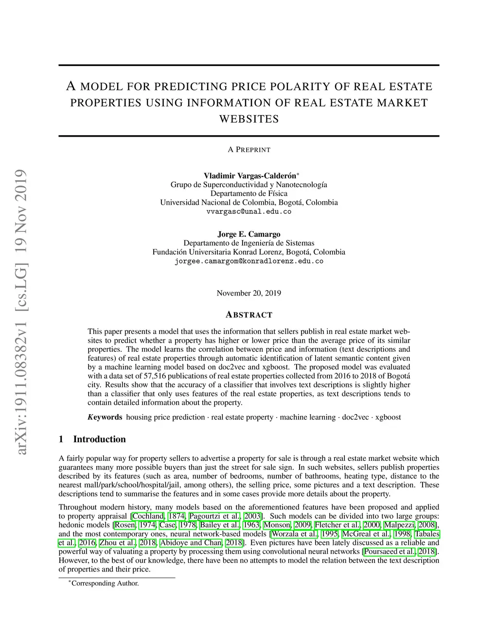 This paper presents a model that uses the information that sellers publish in real estate market websites to predict whether a property has higher or lower price than the average price of its similar properties. The model learns the correlation between price and information (text descriptions and features) of real estate properties through automatic identification of latent semantic content given by a machine learning model based on doc2vec and xgboost. The proposed model was evaluated with a data set of 57,516 publications of real estate properties collected from 2016 to 2018 of Bogot\á city. Results show that the accuracy of a classifier that involves text descriptions is slightly higher than a classifier that only uses features of the real estate properties, as text descriptions tends to contain detailed information about the property.
