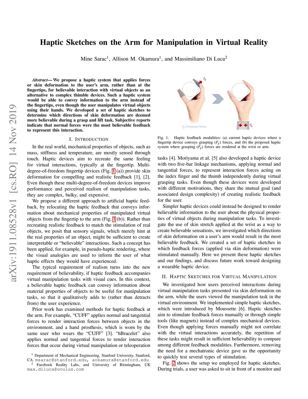 We propose a haptic system that applies forces or skin deformation to the user's arm, rather than at the fingertips, for believable interaction with virtual objects as an alternative to complex thimble devices. Such a haptic system would be able to convey information to the arm instead of the fingertips, even though the user manipulates virtual objects using their hands. We developed a set of haptic sketches to determine which directions of skin deformation are deemed more believable during a grasp and lift task. Subjective reports indicate that normal forces were the most believable feedback to represent this interaction.
