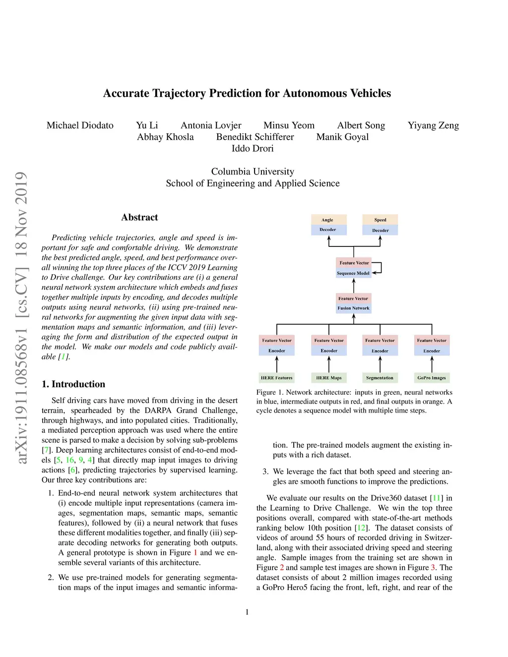 Predicting vehicle trajectories, angle and speed is important for safe and comfortable driving. We demonstrate the best predicted angle, speed, and best performance overall winning the top three places of the ICCV 2019 Learning to Drive challenge. Our key contributions are (i) a general neural network system architecture which embeds and fuses together multiple inputs by encoding, and decodes multiple outputs using neural networks, (ii) using pre-trained neural networks for augmenting the given input data with segmentation maps and semantic information, and (iii) leveraging the form and distribution of the expected output in the model.