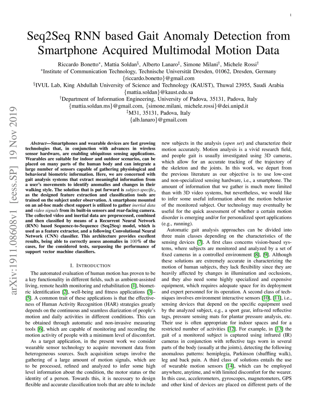 Smartphones and wearable devices are fast growing technologies that, in conjunction with advances in wireless sensor hardware, are enabling ubiquitous sensing applications. Wearables are suitable for indoor and outdoor scenarios, can be placed on many parts of the human body and can integrate a large number of sensors capable of gathering physiological and behavioral biometric information. Here, we are concerned with gait analysis systems that extract meaningful information from a user's movements to identify anomalies and changes in their walking style. The solution that is put forward is subject-specific, as the designed feature extraction and classification tools are trained on the subject under observation. A smartphone mounted on an ad-hoc made chest support is utilized to gather inertial data and video signals from its built-in sensors and rear-facing camera. The collected video and inertial data are preprocessed, combined and then classified by means of a Recurrent Neural Network (RNN) based Sequence-to-Sequence (Seq2Seq) model, which is used as a feature extractor, and a following Convolutional Neural Network (CNN) classifier. This architecture provides excellent results, being able to correctly assess anomalies in 100% of the cases, for the considered tests, surpassing the performance of support vector machine classifiers.