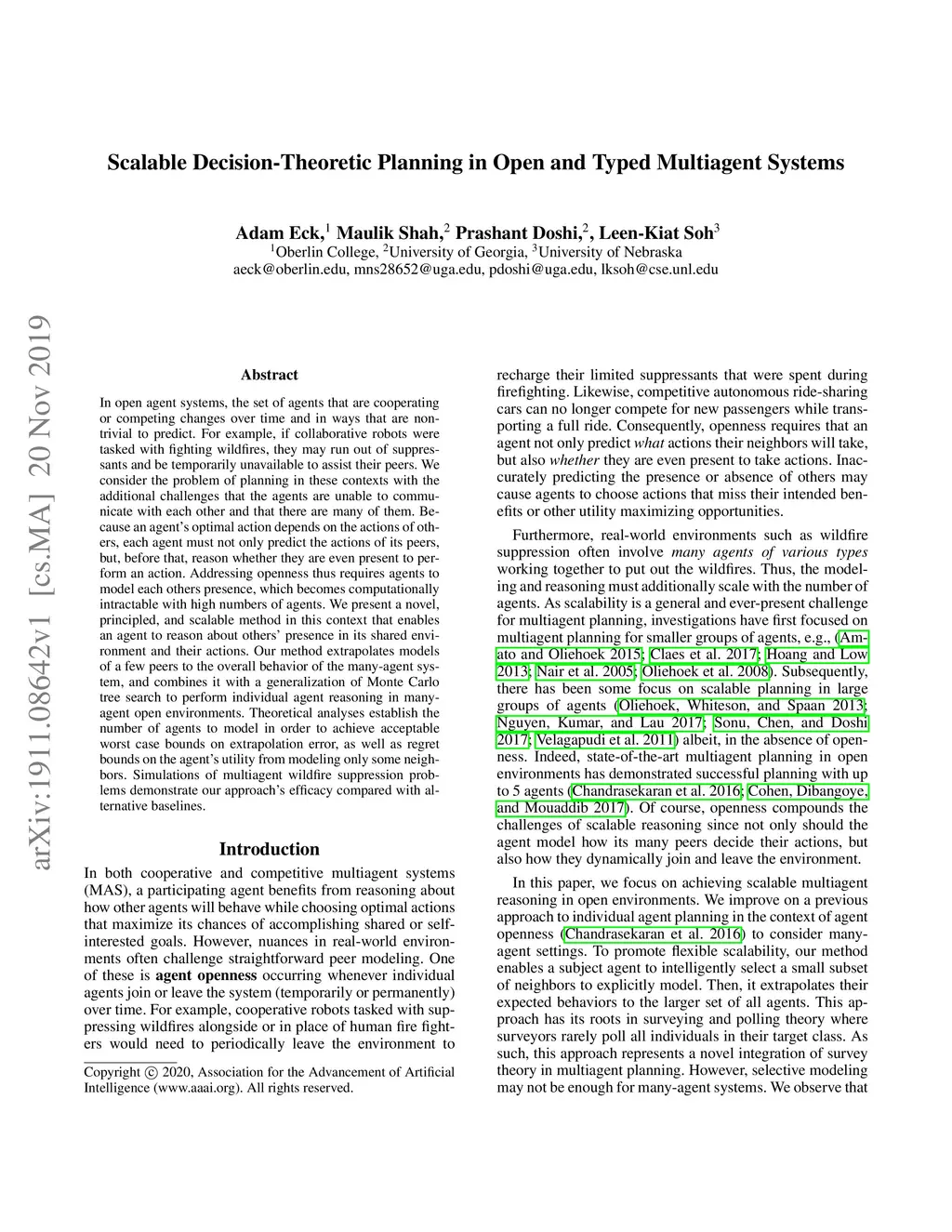 In open agent systems, the set of agents that are cooperating or competing changes over time and in ways that are nontrivial to predict. For example, if collaborative robots were tasked with fighting wildfires, they may run out of suppressants and be temporarily unavailable to assist their peers. We consider the problem of planning in these contexts with the additional challenges that the agents are unable to communicate with each other and that there are many of them. Because an agent's optimal action depends on the actions of others, each agent must not only predict the actions of its peers, but, before that, reason whether they are even present to perform an action. Addressing openness thus requires agents to model each other's presence, which becomes computationally intractable with high numbers of agents. We present a novel, principled, and scalable method in this context that enables an agent to reason about others' presence in its shared environment and their actions. Our method extrapolates models of a few peers to the overall behavior of the many-agent system, and combines it with a generalization of Monte Carlo tree search to perform individual agent reasoning in many-agent open environments. Theoretical analyses establish the number of agents to model in order to achieve acceptable worst case bounds on extrapolation error, as well as regret bounds on the agent's utility from modeling only some neighbors. Simulations of multiagent wildfire suppression problems demonstrate our approach's efficacy compared with alternative baselines.
