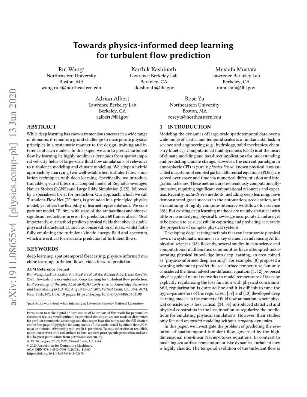 While deep learning has shown tremendous success in a wide range of domains, it remains a grand challenge to incorporate physical principles in a systematic manner to the design, training, and inference of such models. In this paper, we aim to predict turbulent flow by learning its highly nonlinear dynamics from spatiotemporal velocity fields of large-scale fluid flow simulations of relevance to turbulence modeling and climate modeling. We adopt a hybrid approach by marrying two well-established turbulent flow simulation techniques with deep learning. Specifically, we introduce trainable spectral filters in a coupled model of Reynolds-averaged Navier-Stokes (RANS) and Large Eddy Simulation (LES), followed by a specialized U-net for prediction. Our approach, which we call turbulent-Flow Net (TF-Net), is grounded in a principled physics model, yet offers the flexibility of learned representations. We compare our model, TF-Net, with state-of-the-art baselines and observe significant reductions in error for predictions 60 frames ahead. Most importantly, our method predicts physical fields that obey desirable physical characteristics, such as conservation of mass, whilst faithfully emulating the turbulent kinetic energy field and spectrum, which are critical for accurate prediction of turbulent flows.