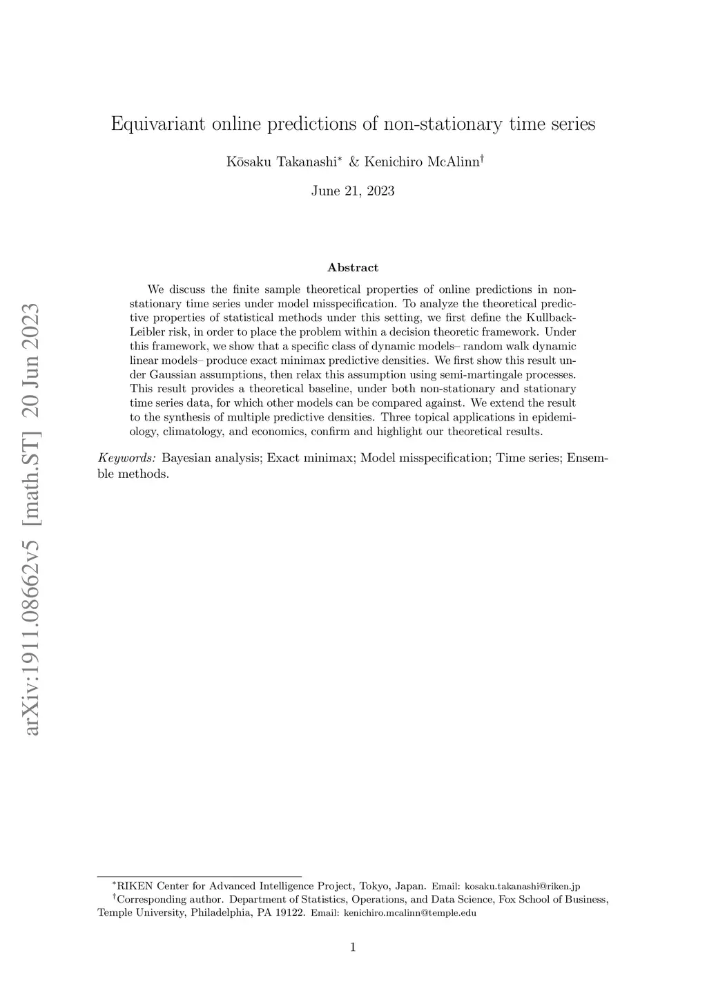 We discuss the finite sample theoretical properties of online predictions in non-stationary time series under model misspecification. To analyze the theoretical predictive properties of statistical methods under this setting, we first define the Kullback-Leibler risk, in order to place the problem within a decision theoretic framework. Under this framework, we show that a specific class of dynamic models -- random walk dynamic linear models -- produce exact minimax predictive densities. We first show this result under Gaussian assumptions, then relax this assumption using semi-martingale processes. This result provides a theoretical baseline, under both non-stationary and stationary time series data, for which other models can be compared against. We extend the result to the synthesis of multiple predictive densities. Three topical applications in epidemiology, climatology, and economics, confirm and highlight our theoretical results.