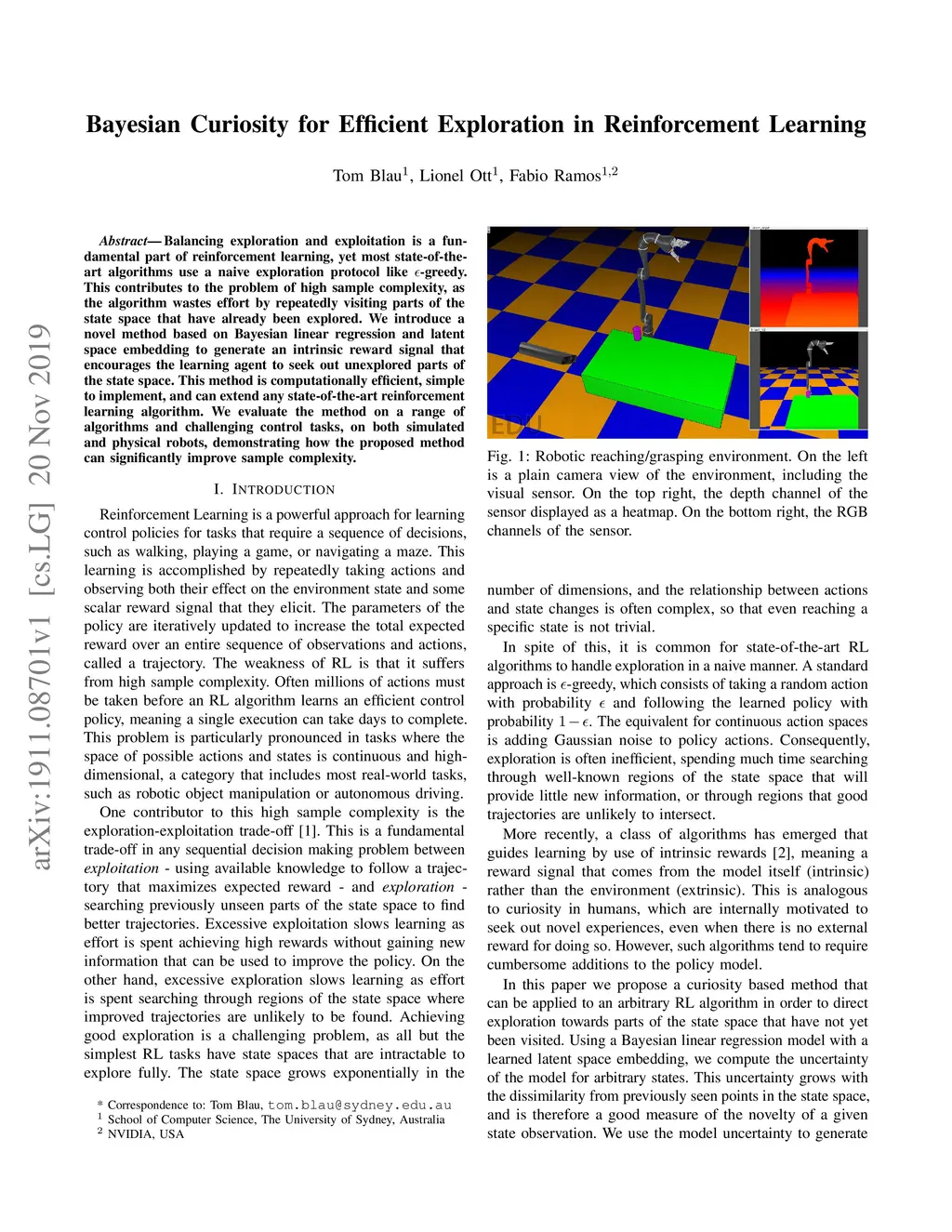 Balancing exploration and exploitation is a fundamental part of reinforcement learning, yet most state-of-the-art algorithms use a naive exploration protocol like -greedy. This contributes to the problem of high sample complexity, as the algorithm wastes effort by repeatedly visiting parts of the state space that have already been explored. We introduce a novel method based on Bayesian linear regression and latent space embedding to generate an intrinsic reward signal that encourages the learning agent to seek out unexplored parts of the state space. This method is computationally efficient, simple to implement, and can extend any state-of-the-art reinforcement learning algorithm. We evaluate the method on a range of algorithms and challenging control tasks, on both simulated and physical robots, demonstrating how the proposed method can significantly improve sample complexity.
