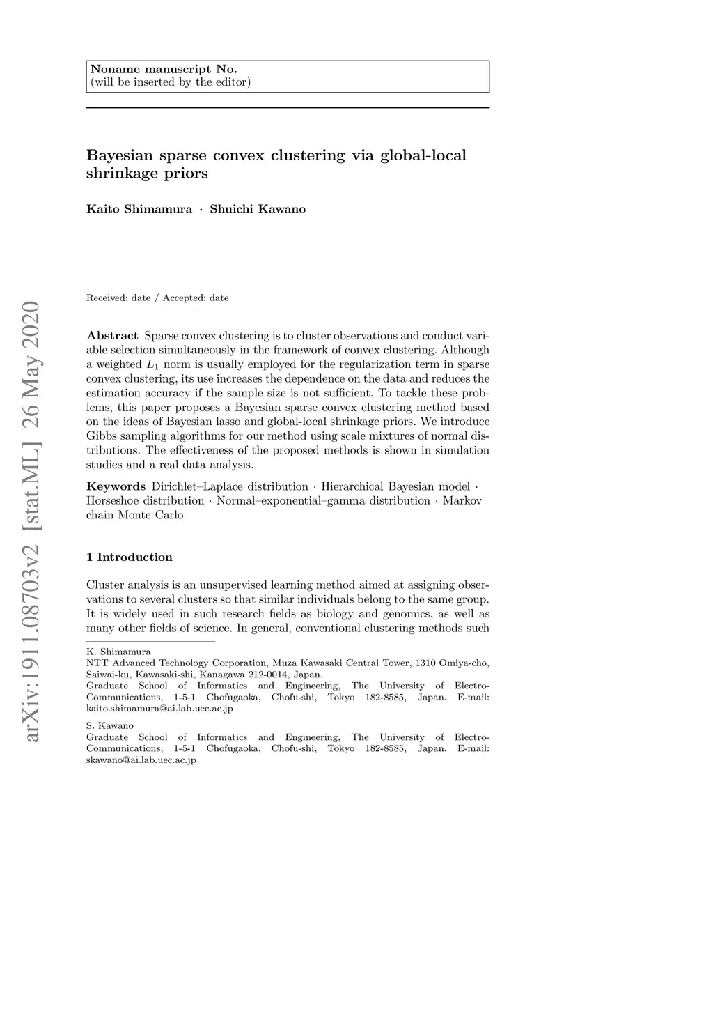 Bayesian sparse convex clustering via global-local shrinkage priors