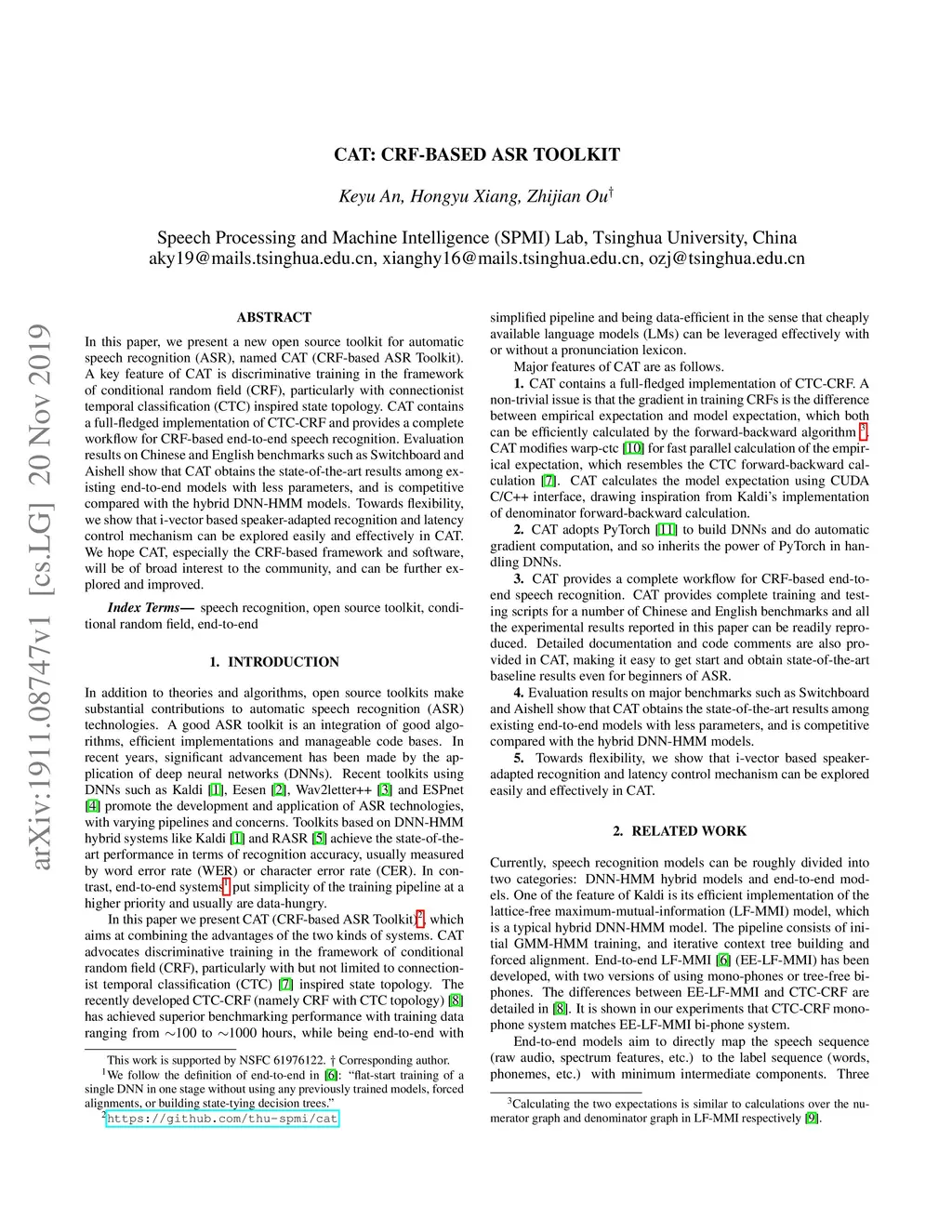 In this paper, we present a new open source toolkit for automatic speech recognition (ASR), named CAT (CRF-based ASR Toolkit). A key feature of CAT is discriminative training in the framework of conditional random field (CRF), particularly with connectionist temporal classification (CTC) inspired state topology. CAT contains a full-fledged implementation of CTC-CRF and provides a complete workflow for CRF-based end-to-end speech recognition. Evaluation results on Chinese and English benchmarks such as Switchboard and Aishell show that CAT obtains the state-of-the-art results among existing end-to-end models with less parameters, and is competitive compared with the hybrid DNN-HMM models. Towards flexibility, we show that i-vector based speaker-adapted recognition and latency control mechanism can be explored easily and effectively in CAT. We hope CAT, especially the CRF-based framework and software, will be of broad interest to the community, and can be further explored and improved.