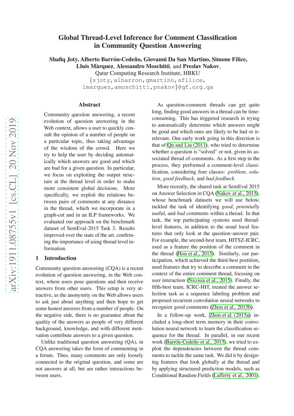 Community question answering, a recent evolution of question answering in the Web context, allows a user to quickly consult the opinion of a number of people on a particular topic, thus taking advantage of the wisdom of the crowd. Here we try to help the user by deciding automatically which answers are good and which are bad for a given question. In particular, we focus on exploiting the output structure at the thread level in order to make more consistent global decisions. More specifically, we exploit the relations between pairs of comments at any distance in the thread, which we incorporate in a graph-cut and in an ILP frameworks. We evaluated our approach on the benchmark dataset of SemEval-2015 Task 3. Results improved over the state of the art, confirming the importance of using thread level information.