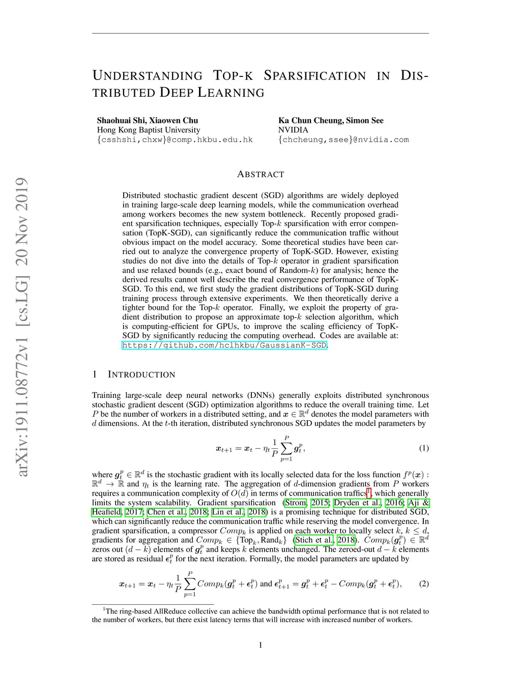 Distributed stochastic gradient descent (SGD) algorithms are widely deployed in training large-scale deep learning models, while the communication overhead among workers becomes the new system bottleneck. Recently proposed gradient sparsification techniques, especially Top- sparsification with error compensation (TopK-SGD), can significantly reduce the communication traffic without an obvious impact on the model accuracy. Some theoretical studies have been carried out to analyze the convergence property of TopK-SGD. However, existing studies do not dive into the details of Top- operator in gradient sparsification and use relaxed bounds (e.g., exact bound of Random-) for analysis; hence the derived results cannot well describe the real convergence performance of TopK-SGD. To this end, we first study the gradient distributions of TopK-SGD during the training process through extensive experiments. We then theoretically derive a tighter bound for the Top- operator. Finally, we exploit the property of gradient distribution to propose an approximate top- selection algorithm, which is computing-efficient for GPUs, to improve the scaling efficiency of TopK-SGD by significantly reducing the computing overhead. Codes are available at: \url{https://github.com/hclhkbu/GaussianK-SGD}.