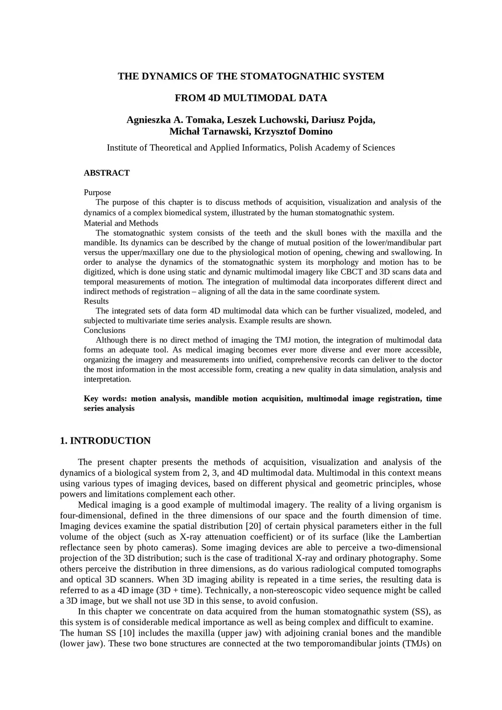 The purpose of this chapter is to discuss methods of acquisition, visualization and analysis of the dynamics of a complex biomedical system, illustrated by the human stomatognathic system. The stomatognathic system consists of the teeth and the skull bones with the maxilla and the mandible. Its dynamics can be described by the change of mutual position of the lower/mandibular part versus the upper/maxillary one due to the physiological motion of opening, chewing and swallowing. In order to analyse the dynamics of the stomatognathic system its morphology and motion has to be digitized, which is done using static and dynamic multimodal imagery like CBCT and 3D scans data and temporal measurements of motion. The integration of multimodal data incorporates different direct and indirect methods of registration - aligning of all the data in the same coordinate system. The integrated sets of data form 4D multimodal data which can be further visualized, modeled, and subjected to multivariate time series analysis. Example results are shown. Although there is no direct method of imaging the TMJ motion, the integration of multimodal data forms an adequate tool. As medical imaging becomes ever more diverse and ever more accessible, organizing the imagery and measurements into unified, comprehensive records can deliver to the doctor the most information in the most accessible form, creating a new quality in data simulation, analysis and interpretation.