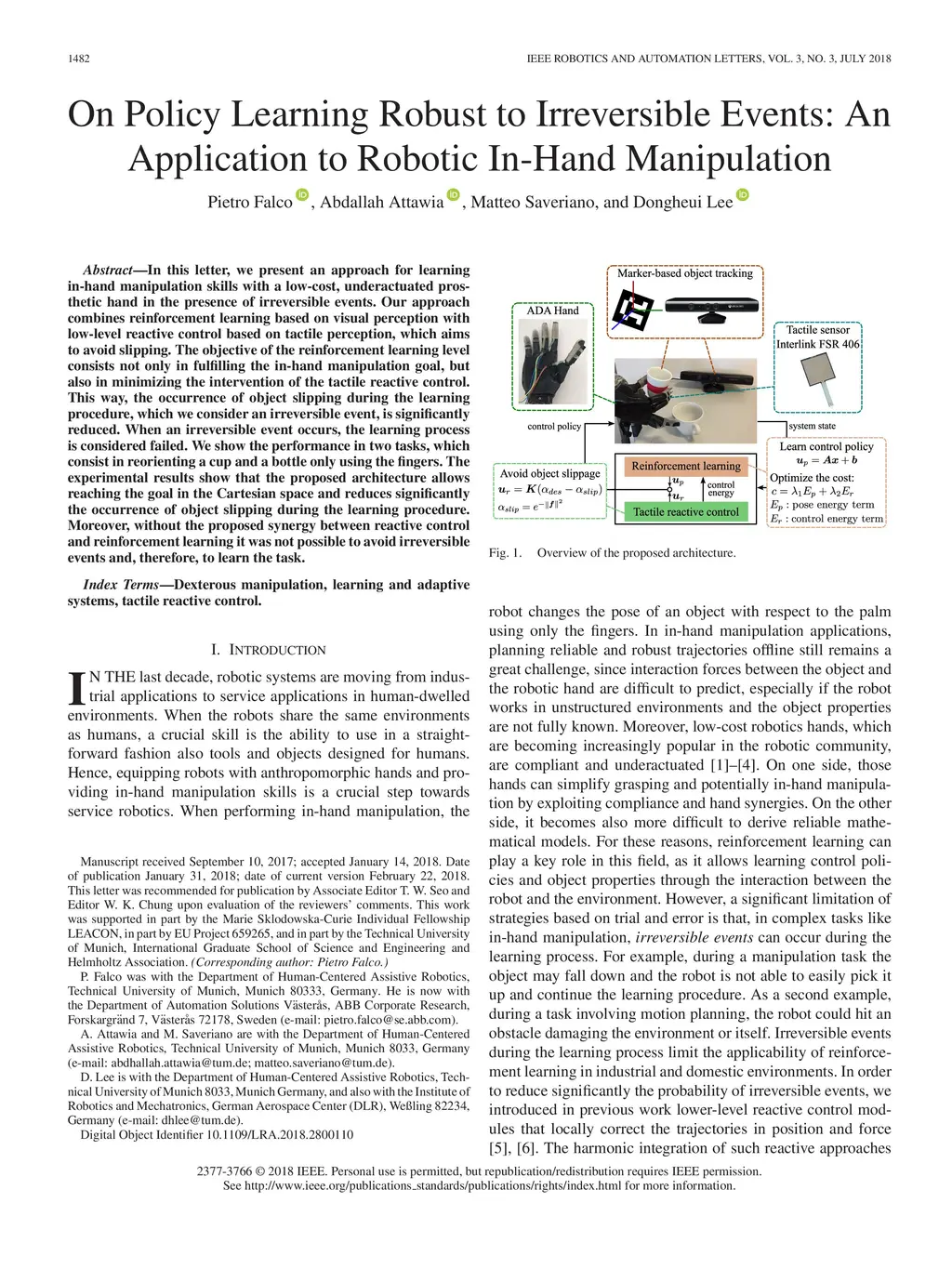 In this letter, we present an approach for learning in-hand manipulation skills with a low-cost, underactuated prosthetic hand in the presence of irreversible events. Our approach combines reinforcement learning based on visual perception with low-level reactive control based on tactile perception, which aims to avoid slipping. The objective of the reinforcement learning level consists not only in fulfilling the in-hand manipulation goal, but also in minimizing the intervention of the tactile reactive control. This way, the occurrence of object slipping during the learning procedure, which we consider an irreversible event, is significantly reduced. When an irreversible event occurs, the learning process is considered failed. We show the performance in two tasks, which consist in reorienting a cup and a bottle only using the fingers. The experimental results show that the proposed architecture allows reaching the goal in the Cartesian space and reduces significantly the occurrence of object slipping during the learning procedure. Moreover, without the proposed synergy between reactive control and reinforcement learning it was not possible to avoid irreversible events and, therefore, to learn the task.
