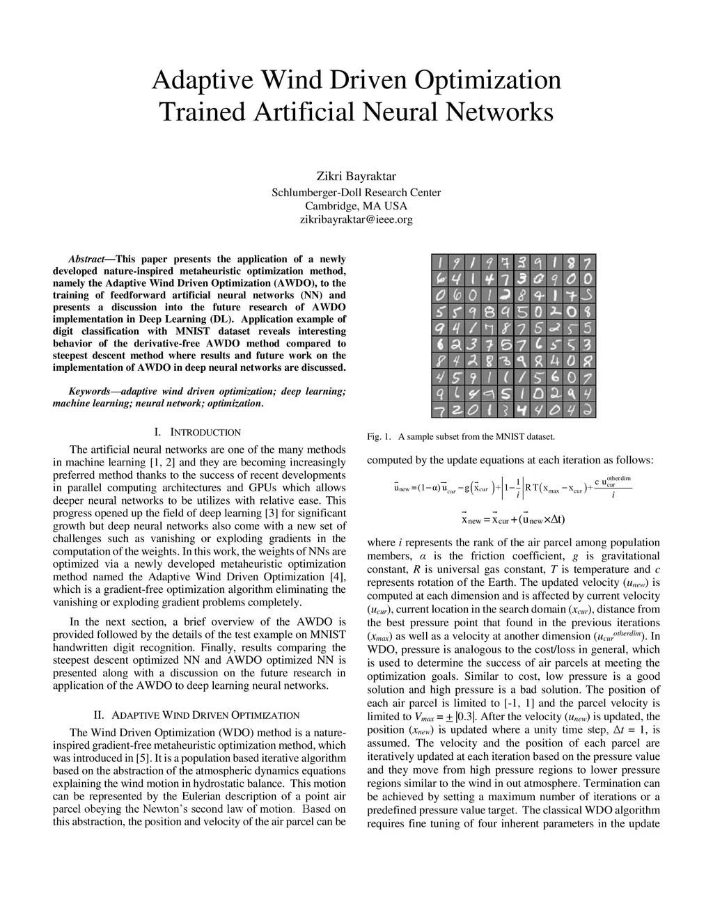 This paper presents the application of a newly developed nature-inspired metaheuristic optimization method, namely the Adaptive Wind Driven Optimization (AWDO), to the training of feedforward artificial neural networks (NN) and presents a discussion into the future research of AWDO implementation in Deep Learning (DL). Application example of digit classification with MNIST dataset reveals interesting behavior of the derivative-free AWDO method compared to steepest descent method where results and future work on the implementation of AWDO in deep neural networks are discussed.