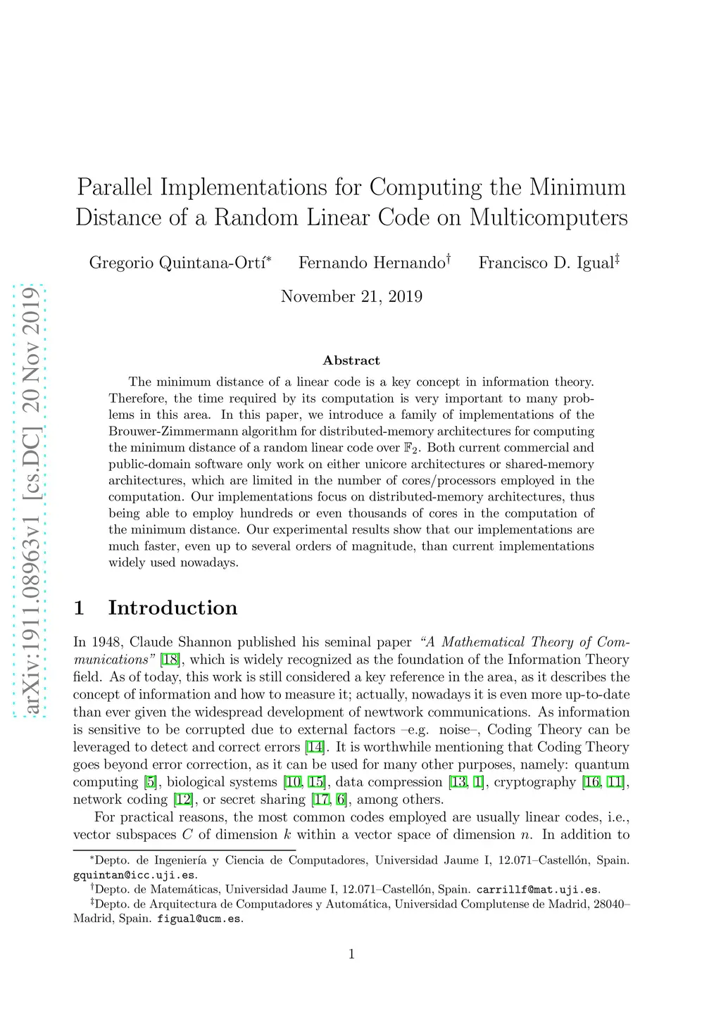 Parallel Implementations for Computing the Minimum Distance of a Random