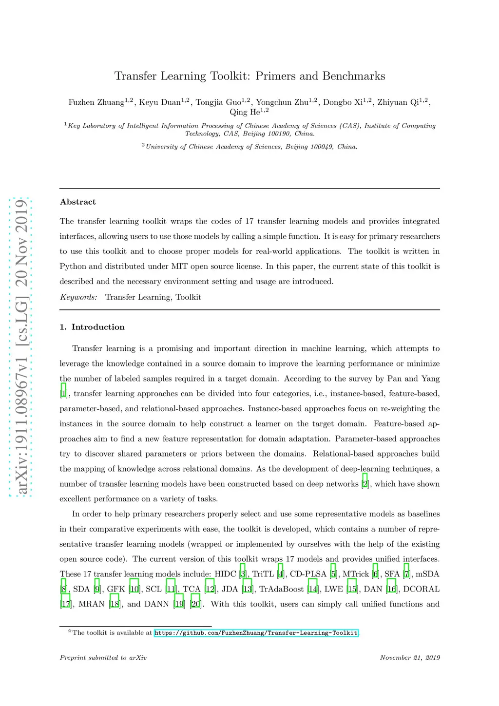 The transfer learning toolkit wraps the codes of 17 transfer learning models and provides integrated interfaces, allowing users to use those models by calling a simple function. It is easy for primary researchers to use this toolkit and to choose proper models for real-world applications. The toolkit is written in Python and distributed under MIT open source license. In this paper, the current state of this toolkit is described and the necessary environment setting and usage are introduced.