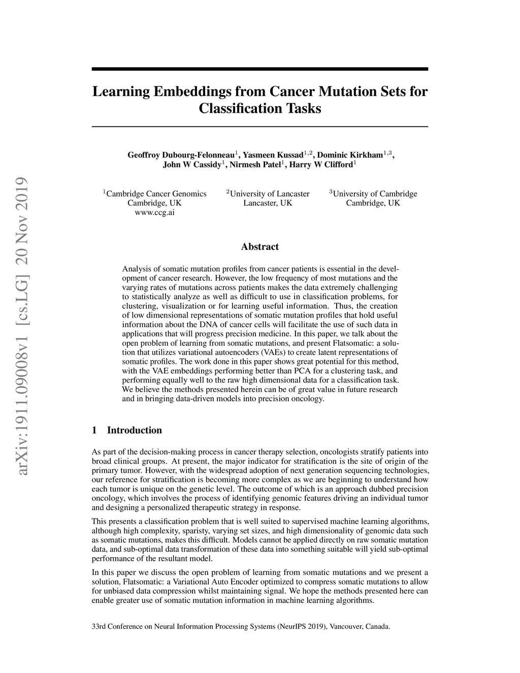 Learning Embeddings from Cancer Mutation Sets for Classification Tasks