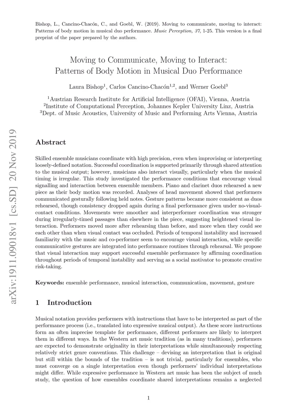 Skilled ensemble musicians coordinate with high precision, even when improvising or interpreting loosely-defined notation. Successful coordination is supported primarily through shared attention to the musical output; however, musicians also interact visually, particularly when the musical timing is irregular. This study investigated the performance conditions that encourage visual signalling and interaction between ensemble members. Piano and clarinet duos rehearsed a new piece as their body motion was recorded. Analyses of head movement showed that performers communicated gesturally following held notes. Gesture patterns became more consistent as duos rehearsed, though consistency dropped again during a final performance given under no-visual-contact conditions. Movements were smoother and interperformer coordination was stronger during irregularly-timed passages than elsewhere in the piece, suggesting heightened visual interaction. Performers moved more after rehearsing than before, and more when they could see each other than when visual contact was occluded. Periods of temporal instability and increased familiarity with the music and co-performer seem to encourage visual interaction, while specific communicative gestures are integrated into performance routines through rehearsal. We propose that visual interaction may support successful ensemble performance by affirming coordination throughout periods of temporal instability and serving as a social motivator to promote creative risk-taking.