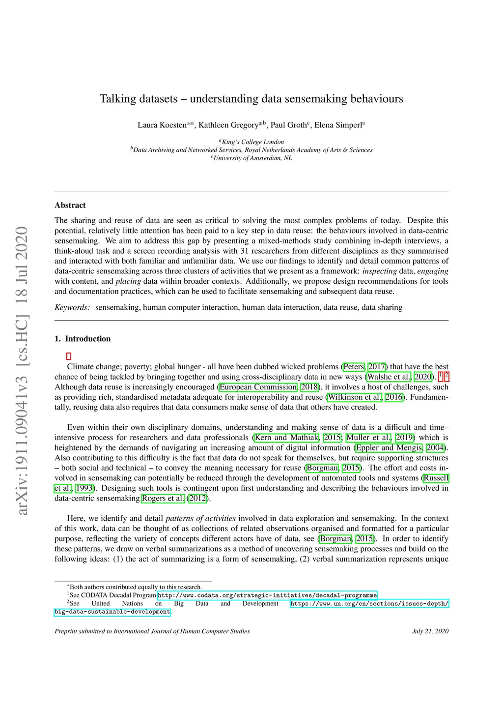 Talking datasets: Understanding data sensemaking behaviours
