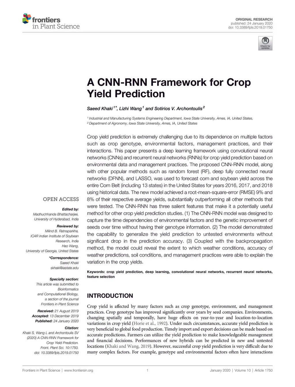 Crop yield prediction is extremely challenging due to its dependence on multiple factors such as crop genotype, environmental factors, management practices, and their interactions. This paper presents a deep learning framework using convolutional neural networks (CNN) and recurrent neural networks (RNN) for crop yield prediction based on environmental data and management practices. The proposed CNN-RNN model, along with other popular methods such as random forest (RF), deep fully-connected neural networks (DFNN), and LASSO, was used to forecast corn and soybean yield across the entire Corn Belt (including 13 states) in the United States for years 2016, 2017, and 2018 using historical data. The new model achieved a root-mean-square-error (RMSE) 9% and 8% of their respective average yields, substantially outperforming all other methods that were tested. The CNN-RNN have three salient features that make it a potentially useful method for other crop yield prediction studies. (1) The CNN-RNN model was designed to capture the time dependencies of environmental factors and the genetic improvement of seeds over time without having their genotype information. (2) The model demonstrated the capability to generalize the yield prediction to untested environments without significant drop in the prediction accuracy. (3) Coupled with the backpropagation method, the model could reveal the extent to which weather conditions, accuracy of weather predictions, soil conditions, and management practices were able to explain the variation in the crop yields.