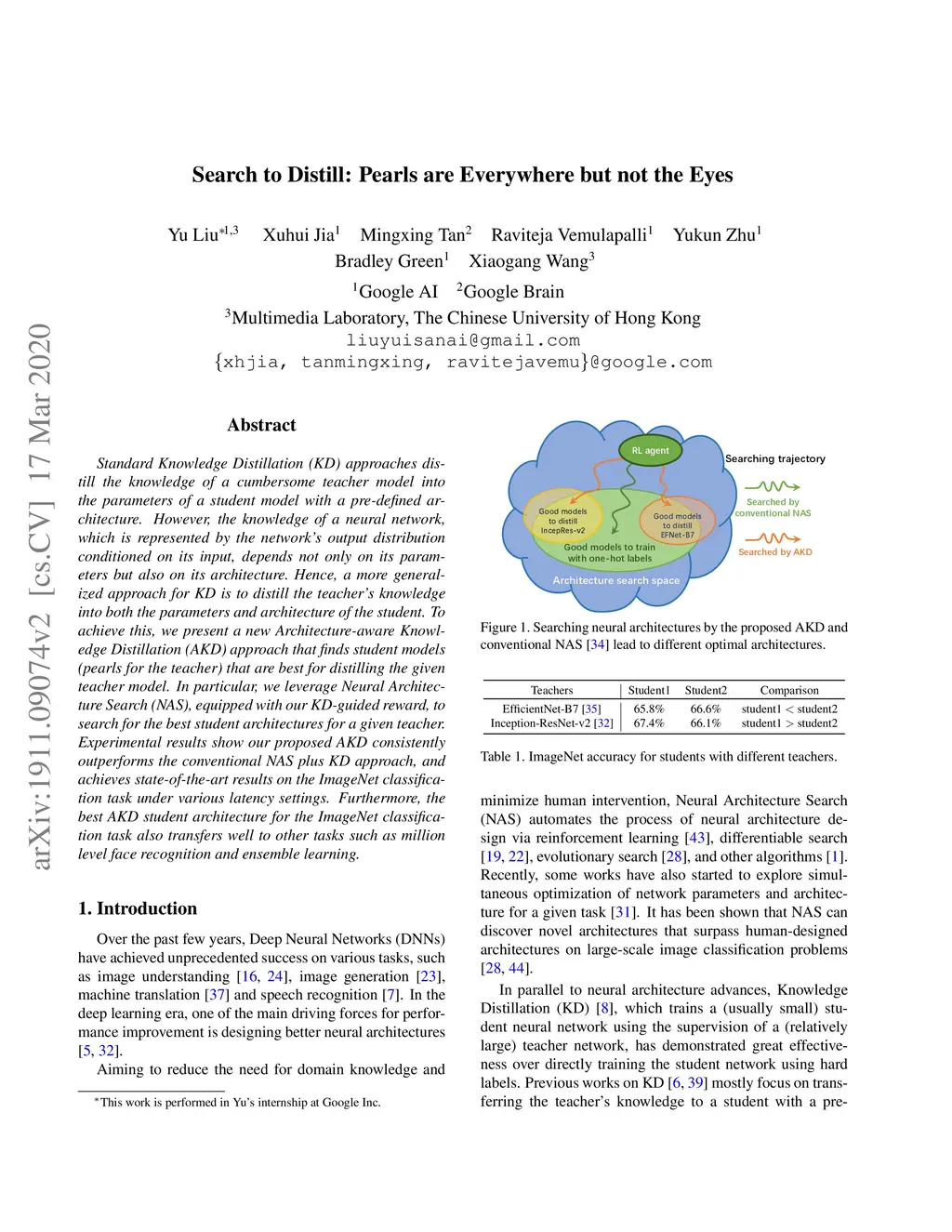 Standard Knowledge Distillation (KD) approaches distill the knowledge of a cumbersome teacher model into the parameters of a student model with a pre-defined architecture. However, the knowledge of a neural network, which is represented by the network's output distribution conditioned on its input, depends not only on its parameters but also on its architecture. Hence, a more generalized approach for KD is to distill the teacher's knowledge into both the parameters and architecture of the student. To achieve this, we present a new Architecture-aware Knowledge Distillation (AKD) approach that finds student models (pearls for the teacher) that are best for distilling the given teacher model. In particular, we leverage Neural Architecture Search (NAS), equipped with our KD-guided reward, to search for the best student architectures for a given teacher. Experimental results show our proposed AKD consistently outperforms the conventional NAS plus KD approach, and achieves state-of-the-art results on the ImageNet classification task under various latency settings. Furthermore, the best AKD student architecture for the ImageNet classification task also transfers well to other tasks such as million level face recognition and ensemble learning.
