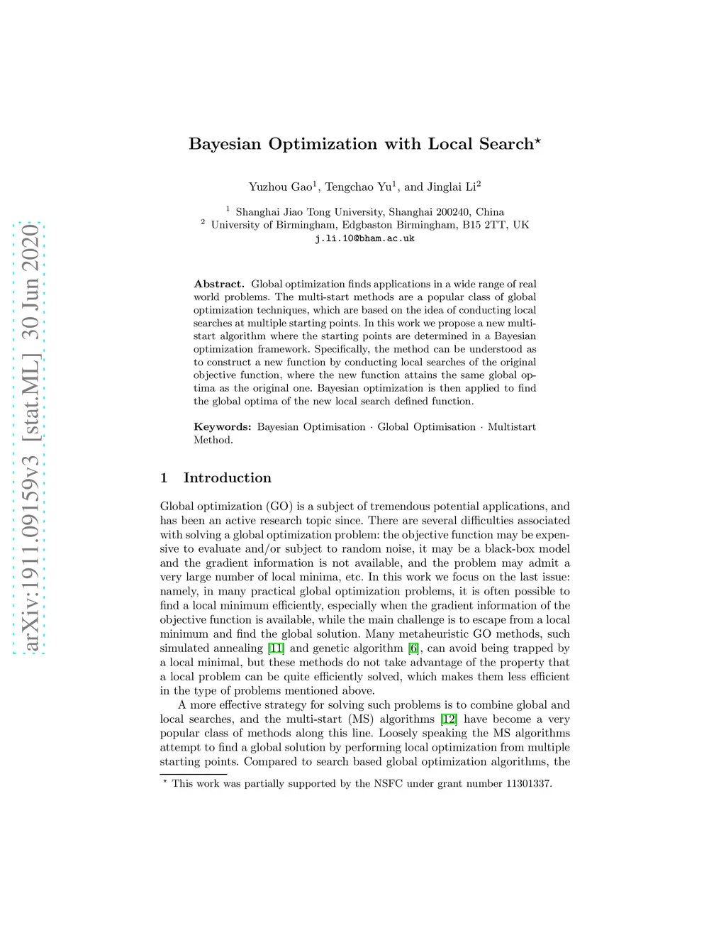 Global optimization finds applications in a wide range of real world problems. The multi-start methods are a popular class of global optimization techniques, which are based on the ideas of conducting local searches at multiple starting points. In this work we propose a new multi-start algorithm where the starting points are determined in a Bayesian optimization framework. Specifically, the method can be understood as to construct a new function by conducting local searches of the original objective function, where the new function attains the same global optima as the original one. Bayesian optimization is then applied to find the global optima of the new local search defined function.