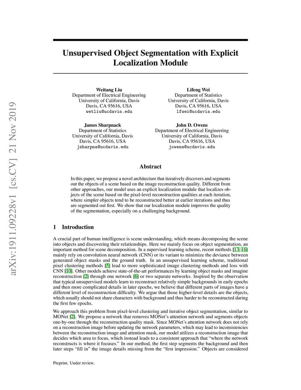 In this paper, we propose a novel architecture that iteratively discovers and segments out the objects of a scene based on the image reconstruction quality. Different from other approaches, our model uses an explicit localization module that localizes objects of the scene based on the pixel-level reconstruction qualities at each iteration, where simpler objects tend to be reconstructed better at earlier iterations and thus are segmented out first. We show that our localization module improves the quality of the segmentation, especially on a challenging background.