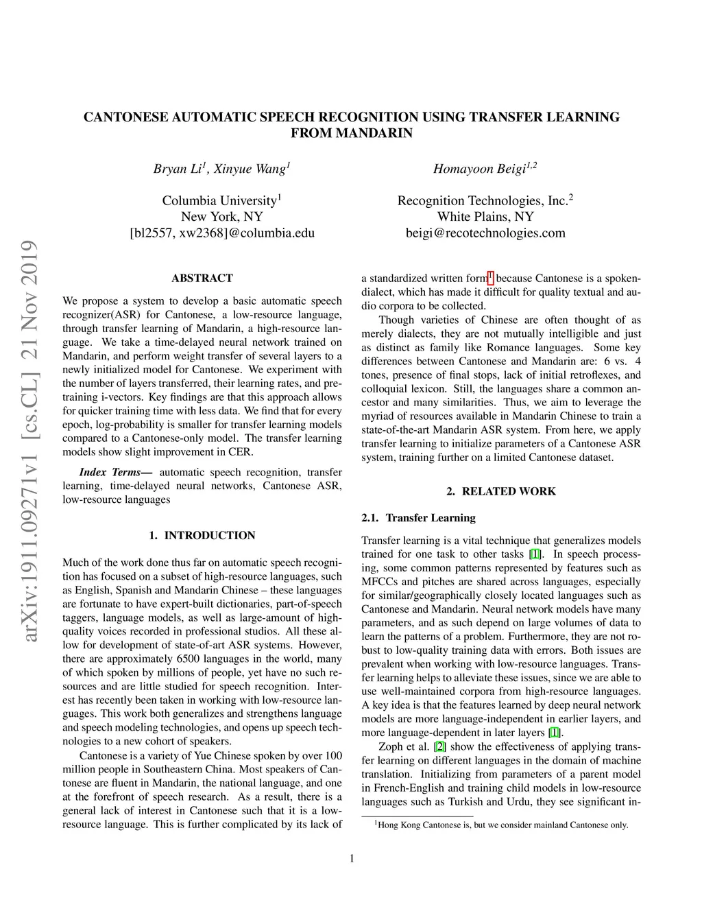 We propose a system to develop a basic automatic speech recognizer(ASR) for Cantonese, a low-resource language, through transfer learning of Mandarin, a high-resource language. We take a time-delayed neural network trained on Mandarin, and perform weight transfer of several layers to a newly initialized model for Cantonese. We experiment with the number of layers transferred, their learning rates, and pretraining i-vectors. Key findings are that this approach allows for quicker training time with less data. We find that for every epoch, log-probability is smaller for transfer learning models compared to a Cantonese-only model. The transfer learning models show slight improvement in CER.