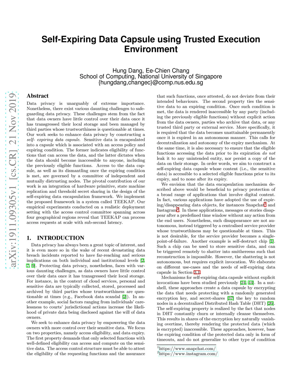 Data privacy is unarguably of extreme importance. Nonetheless, there exist various daunting challenges to safe-guarding data privacy. These challenges stem from the fact that data owners have little control over their data once it has transgressed their local storage and been managed by third parties whose trustworthiness is questionable at times. Our work seeks to enhance data privacy by constructing a self-expiring data capsule. Sensitive data is encapsulated into a capsule which is associated with an access policy an expiring condition. The former indicates eligibility of functions that can access the data, and the latter dictates when the data should become inaccessible to anyone, including the previously eligible functions. Access to the data capsule, as well as its dismantling once the expiring condition is met, are governed by a committee of independent and mutually distrusting nodes. The pivotal contribution of our work is an integration of hardware primitive, state machine replication and threshold secret sharing in the design of the self-expiring data encapsulation framework. We implement the proposed framework in a system called TEEKAP. Our empirical experiments conducted on a realistic deployment setting with the access control committee spanning across four geographical regions reveal that TEEKAP can process access requests at scale with sub-second latency.