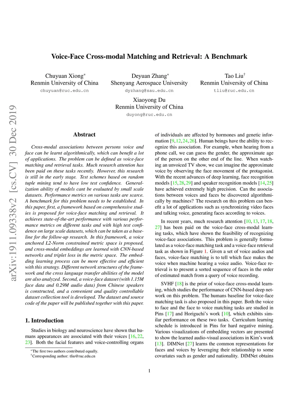 Voice-Face Cross-modal Matching and Retrieval: A Benchmark