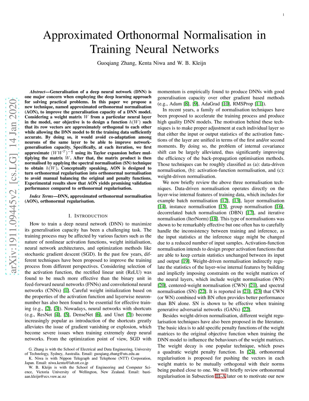 Generalisation of a deep neural network (DNN) is one major concern when employing the deep learning approach for solving practical problems. In this paper we propose a new technique, named approximated orthonormal normalisation (AON), to improve the generalisation capacity of a DNN model. Considering a weight matrix W from a particular neural layer in the model, our objective is to design a function h(W) such that its row vectors are approximately orthogonal to each other while allowing the DNN model to fit the training data sufficiently accurate. By doing so, it would avoid co-adaptation among neurons of the same layer to be able to improve network-generalisation capacity. Specifically, at each iteration, we first approximate (WW^T)^(-1/2) using its Taylor expansion before multiplying the matrix W. After that, the matrix product is then normalised by applying the spectral normalisation (SN) technique to obtain h(W). Conceptually speaking, AON is designed to turn orthonormal regularisation into orthonormal normalisation to avoid manual balancing the original and penalty functions. Experimental results show that AON yields promising validation performance compared to orthonormal regularisation.