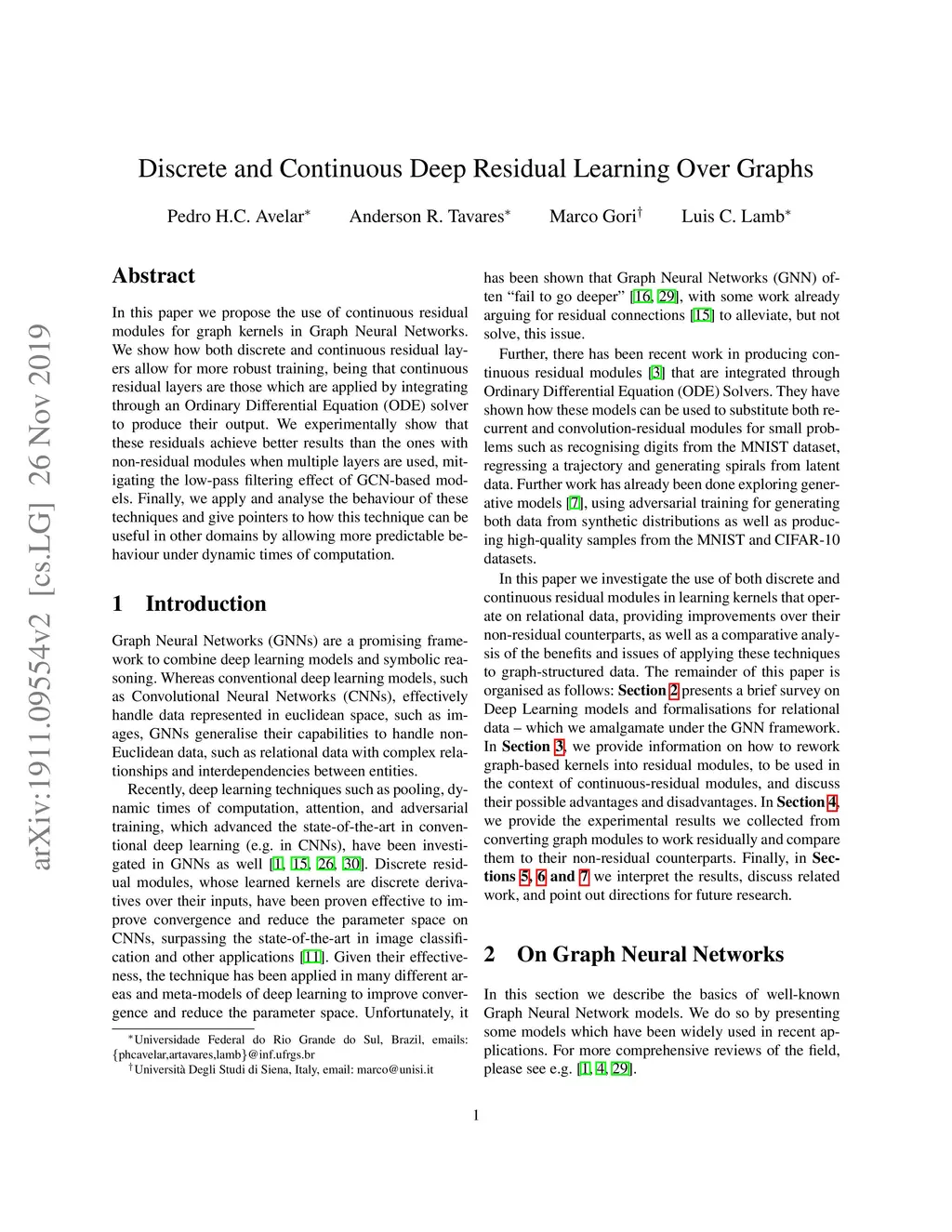 In this paper we propose the use of continuous residual modules for graph kernels in Graph Neural Networks. We show how both discrete and continuous residual layers allow for more robust training, being that continuous residual layers are those which are applied by integrating through an Ordinary Differential Equation (ODE) solver to produce their output. We experimentally show that these residuals achieve better results than the ones with non-residual modules when multiple layers are used, mitigating the low-pass filtering effect of GCN-based models. Finally, we apply and analyse the behaviour of these techniques and give pointers to how this technique can be useful in other domains by allowing more predictable behaviour under dynamic times of computation.