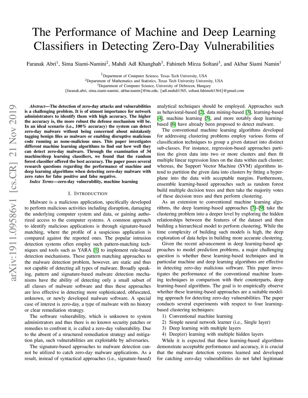 The detection of zero-day attacks and vulnerabilities is a challenging problem. It is of utmost importance for network administrators to identify them with high accuracy. The higher the accuracy is, the more robust the defense mechanism will be. In an ideal scenario (i.e., 100% accuracy) the system can detect zero-day malware without being concerned about mistakenly tagging benign files as malware or enabling disruptive malicious code running as none-malicious ones. This paper investigates different machine learning algorithms to find out how well they can detect zero-day malware. Through the examination of 34 machine/deep learning classifiers, we found that the random forest classifier offered the best accuracy. The paper poses several research questions regarding the performance of machine and deep learning algorithms when detecting zero-day malware with zero rates for false positive and false negative.
