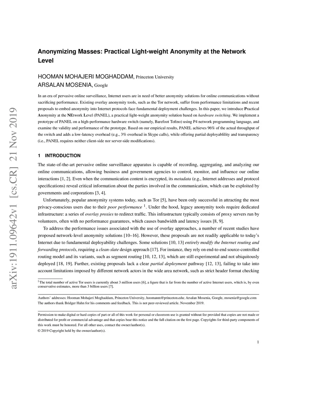 In an era of pervasive online surveillance, Internet users are in need of better anonymity solutions for online communications without sacrificing performance. Existing overlay anonymity tools, such as the Tor network, suffer from performance limitations and recent proposals to embed anonymity into Internet protocols face fundamental deployment challenges. In this paper, we introduce Practical Anonymity at the NEtwork Level (PANEL), a practical light-weight anonymity solution based on hardware switching. We implement a prototype of PANEL on a high-performance hardware switch (namely, Barefoot Tofino) using P4 network programming language, and examine the validity and performance of the prototype. Based on our empirical results, PANEL achieves 96% of the actual throughput of the switch and adds a low-latency overhead (e.g., 3% overhead in Skype calls), while offering partial deployablility and transparency (i.e., PANEL requires neither client-side nor server-side modifications).