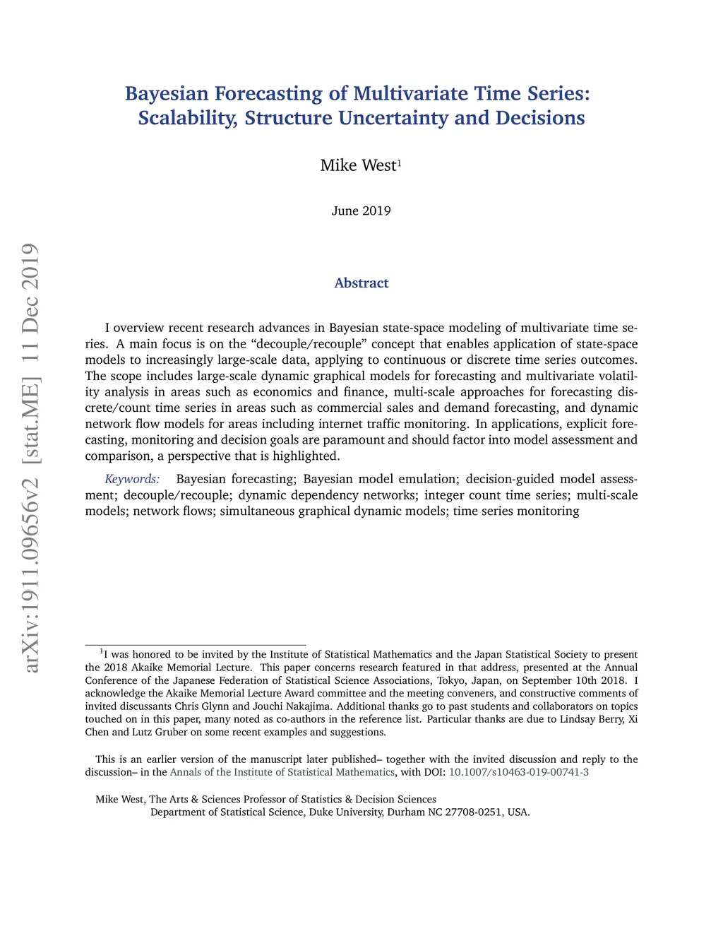I overview recent research advances in Bayesian state-space modeling of multivariate time series. A main focus is on the decouple/recouple concept that enables application of state-space models to increasingly large-scale data, applying to continuous or discrete time series outcomes. The scope includes large-scale dynamic graphical models for forecasting and multivariate volatility analysis in areas such as economics and finance, multi-scale approaches for forecasting discrete/count time series in areas such as commercial sales and demand forecasting, and dynamic network flow models for areas including internet traffic monitoring. In applications, explicit forecasting, monitoring and decision goals are paramount and should factor into model assessment and comparison, a perspective that is highlighted.