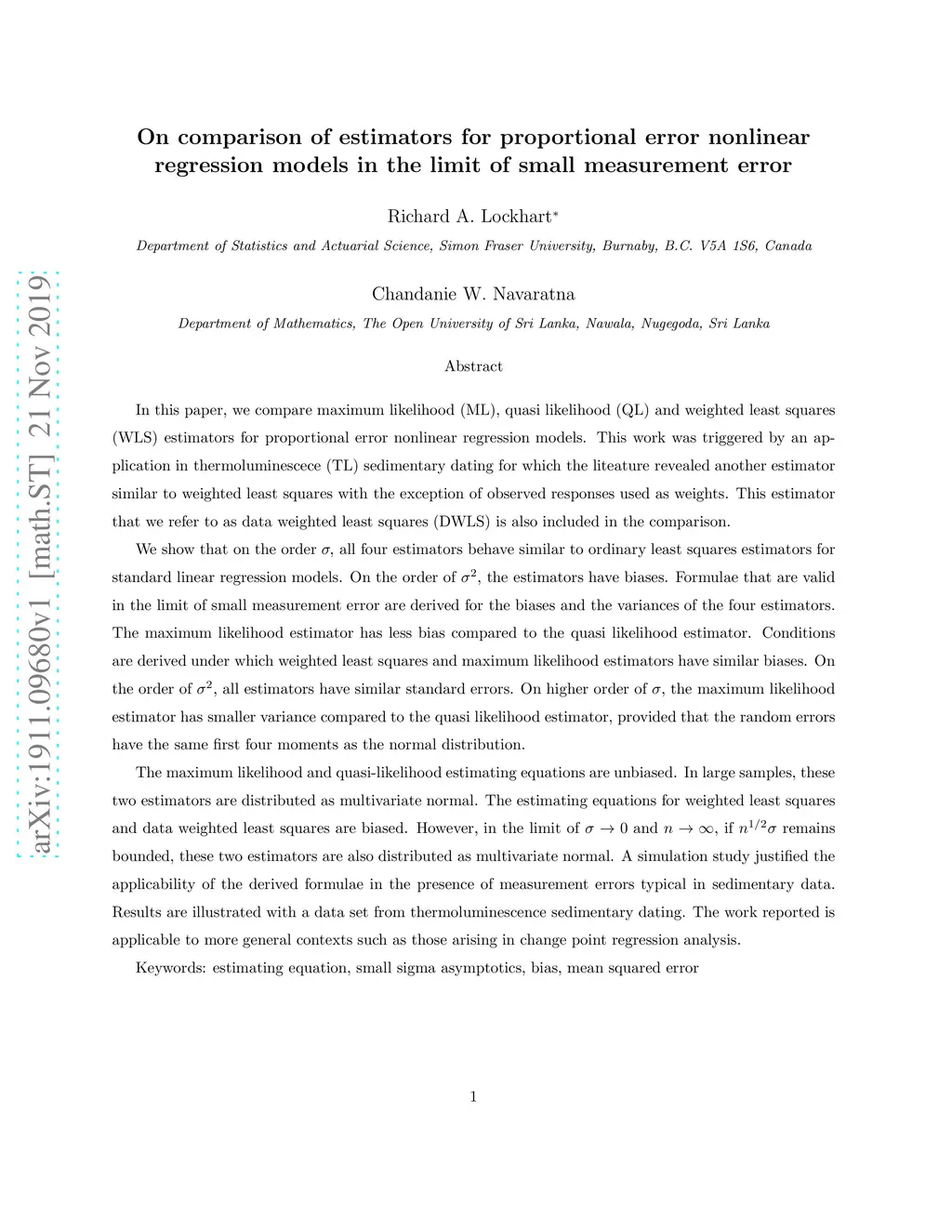 In this paper, we compare maximum likelihood (ML), quasi likelihood (QL) and weighted least squares (WLS) estimators for proportional error nonlinear regression models. Literature on thermoluminescence sedimentary dating revealed another estimator similar to weighted least squares but observed responses used as weights. This estimator that we refer to as data weighted least squares (DWLS) is also included in the comparison. We show that on the order $\sigma, $ all four estimators behave similar to ordinary least squares estimators for standard linear regression models. On the order of $\sigma^2, $ the estimators have biases. Formulae that are valid in the limit of small measurement error are derived for the biases and the variances of the four estimators. The maximum likelihood estimator has less bias compared to the quasi likelihood estimator. Conditions are derived under which weighted least squares and maximum likelihood estimators have similar biases. On the order of $\sigma^ {2} $, all estimators have similar standard errors. On higher order of , maximum likelihood estimator has smaller variance compared to quasi likelihood estimator, provided that the random errors have the same first four moments as the normal distribution. The maximum likelihood and quasi-likelihood estimating equations are unbiased. In large samples, these two estimators are distributed as multivariate normal. The estimating equations for weighted least squares and data weighted least squares are biased. However, in the limit of and $n \to \infty, $ if $ n^ {1/2} \sigma$ remains bounded, these two estimators are also distributed as multivariate normal. A simulation study justified the applicability of the derived formulae in the presence of measurement errors typical in sedimentary data. Results are illustrated with a data set from thermoluminescence sedimentary dating.