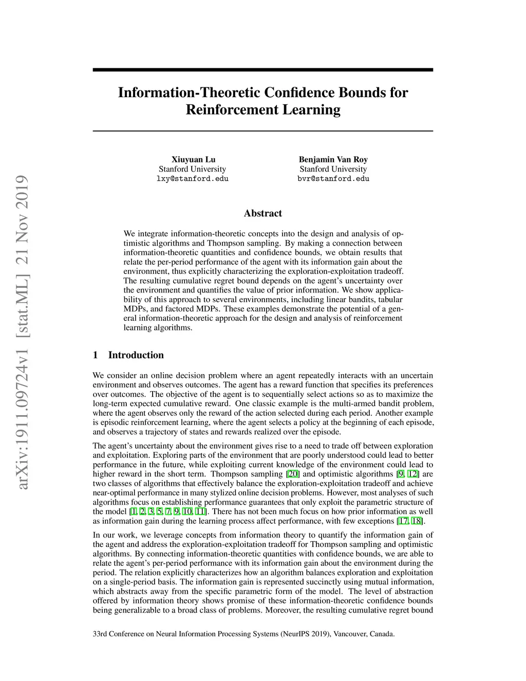 We integrate information-theoretic concepts into the design and analysis of optimistic algorithms and Thompson sampling. By making a connection between information-theoretic quantities and confidence bounds, we obtain results that relate the per-period performance of the agent with its information gain about the environment, thus explicitly characterizing the exploration-exploitation tradeoff. The resulting cumulative regret bound depends on the agent's uncertainty over the environment and quantifies the value of prior information. We show applicability of this approach to several environments, including linear bandits, tabular MDPs, and factored MDPs. These examples demonstrate the potential of a general information-theoretic approach for the design and analysis of reinforcement learning algorithms.