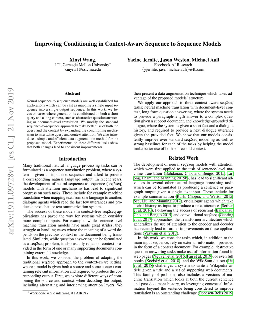 Neural sequence to sequence models are well established for applications which can be cast as mapping a single input sequence into a single output sequence. In this work, we focus on cases where generation is conditioned on both a short query and a long context, such as abstractive question answering or document-level translation. We modify the standard sequence-to-sequence approach to make better use of both the query and the context by expanding the conditioning mechanism to intertwine query and context attention. We also introduce a simple and efficient data augmentation method for the proposed model. Experiments on three different tasks show that both changes lead to consistent improvements.