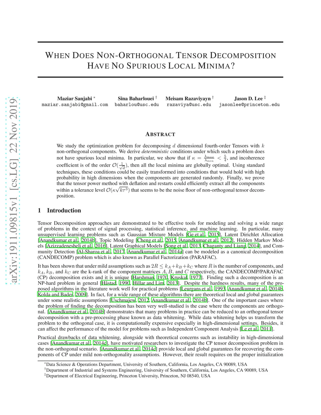 We study the optimization problem for decomposing dimensional fourth-order Tensors with non-orthogonal components. We derive \textit{deterministic} conditions under which such a problem does not have spurious local minima. In particular, we show that if , and incoherence coefficient is of the order , then all the local minima are globally optimal. Using standard techniques, these conditions could be easily transformed into conditions that would hold with high probability in high dimensions when the components are generated randomly. Finally, we prove that the tensor power method with deflation and restarts could efficiently extract all the components within a tolerance level that seems to be the noise floor of non-orthogonal tensor decomposition.