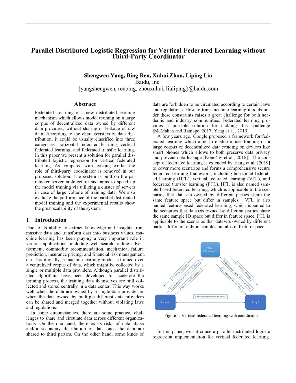 Federated Learning is a new distributed learning mechanism which allows model training on a large corpus of decentralized data owned by different data providers, without sharing or leakage of raw data. According to the characteristics of data dis-tribution, it could be usually classified into three categories: horizontal federated learning, vertical federated learning, and federated transfer learning. In this paper we present a solution for parallel dis-tributed logistic regression for vertical federated learning. As compared with existing works, the role of third-party coordinator is removed in our proposed solution. The system is built on the pa-rameter server architecture and aims to speed up the model training via utilizing a cluster of servers in case of large volume of training data. We also evaluate the performance of the parallel distributed model training and the experimental results show the great scalability of the system.