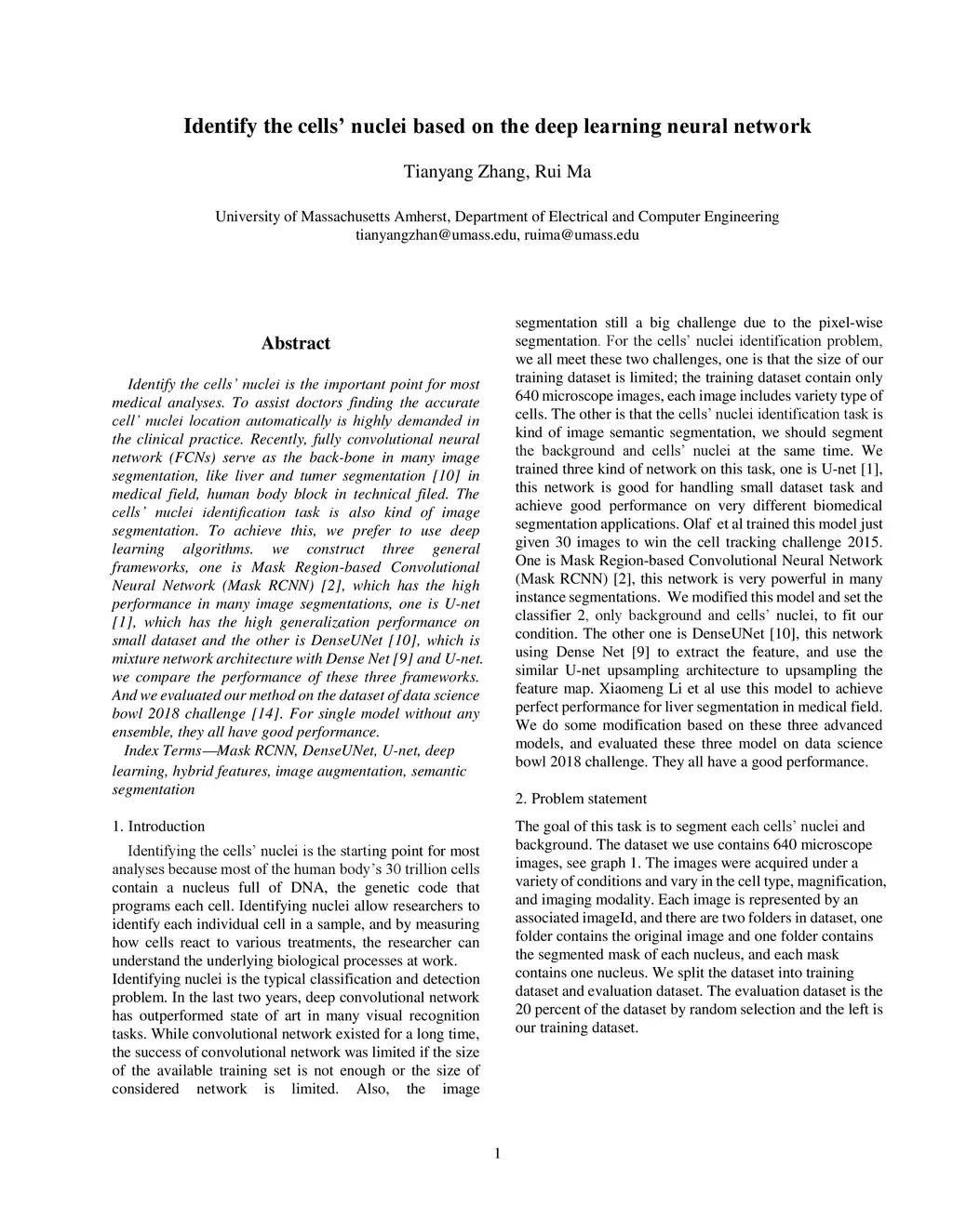 Identify the cells' nuclei is the important point for most medical analyses. To assist doctors finding the accurate cell' nuclei location automatically is highly demanded in the clinical practice. Recently, fully convolutional neural network (FCNs) serve as the back-bone in many image segmentation, like liver and tumer segmentation in medical field, human body block in technical filed. The cells' nuclei identification task is also kind of image segmentation. To achieve this, we prefer to use deep learning algorithms. we construct three general frameworks, one is Mask Region-based Convolutional Neural Network (Mask RCNN), which has the high performance in many image segmentations, one is U-net, which has the high generalization performance on small dataset and the other is DenseUNet, which is mixture network architecture with Dense Net and U-net. we compare the performance of these three frameworks. And we evaluated our method on the dataset of data science bowl 2018 challenge. For single model without any ensemble, they all have good performance.