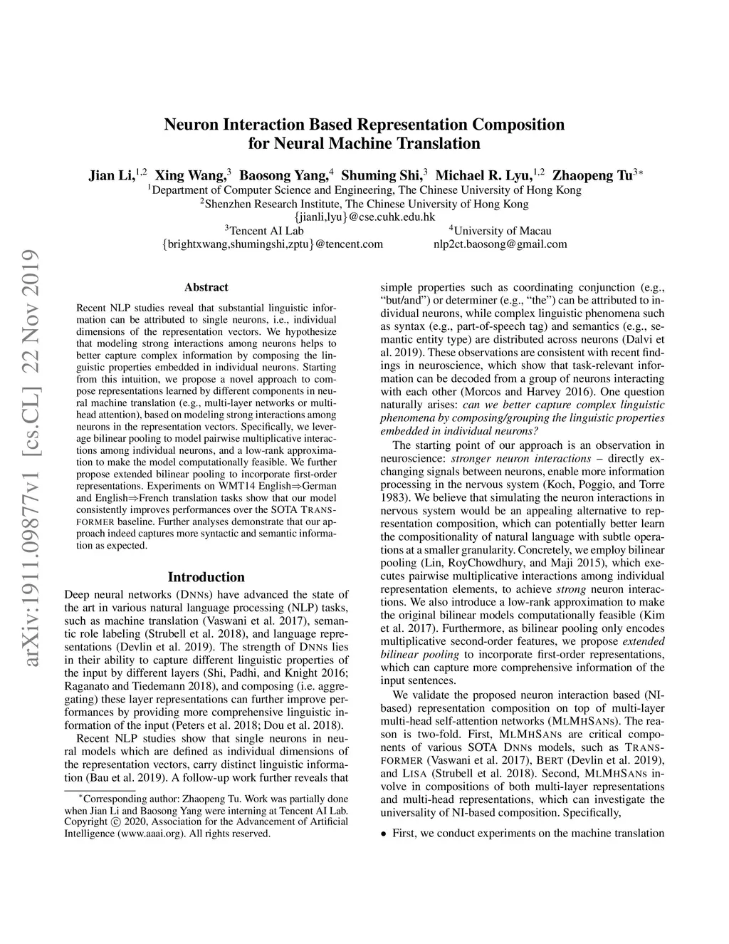 Recent NLP studies reveal that substantial linguistic information can be attributed to single neurons, i.e., individual dimensions of the representation vectors. We hypothesize that modeling strong interactions among neurons helps to better capture complex information by composing the linguistic properties embedded in individual neurons. Starting from this intuition, we propose a novel approach to compose representations learned by different components in neural machine translation (e.g., multi-layer networks or multi-head attention), based on modeling strong interactions among neurons in the representation vectors. Specifically, we leverage bilinear pooling to model pairwise multiplicative interactions among individual neurons, and a low-rank approximation to make the model computationally feasible. We further propose extended bilinear pooling to incorporate first-order representations. Experiments on WMT14 English-German and English-French translation tasks show that our model consistently improves performances over the SOTA Transformer baseline. Further analyses demonstrate that our approach indeed captures more syntactic and semantic information as expected.