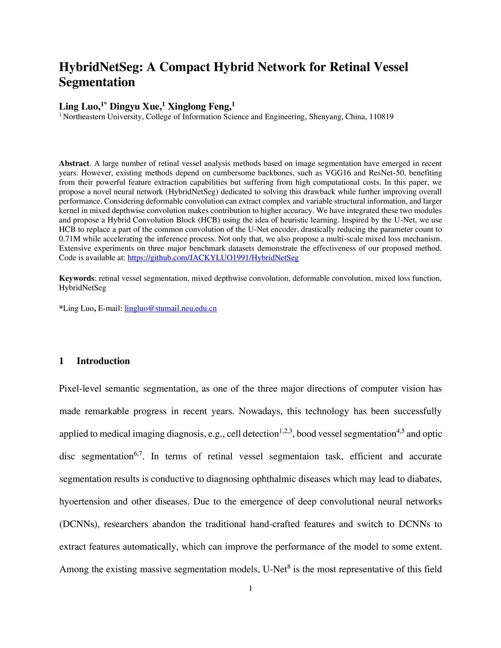 A large number of retinal vessel analysis methods based on image segmentation have emerged in recent years. However, existing methods depend on cumbersome backbones, such as VGG16 and ResNet-50, benefiting from their powerful feature extraction capabilities but suffering from high computational costs. In this paper, we propose a novel neural network (HybridNetSeg) dedicated to solving this drawback while further improving overall performance. Considering deformable convolution can extract complex and variable structural information, and larger kernel in mixed depthwise convolution makes contribution to higher accuracy. We have integrated these two modules and propose a Hybrid Convolution Block (HCB) using the idea of heuristic learning. Inspired by the U-Net, we use HCB to replace a part of the common convolution of the U-Net encoder, drastically reducing the parameter count to 0.71M while accelerating the inference process. Not only that, we also propose a multi-scale mixed loss mechanism. Extensive experiments on three major benchmark datasets demonstrate the effectiveness of our proposed method