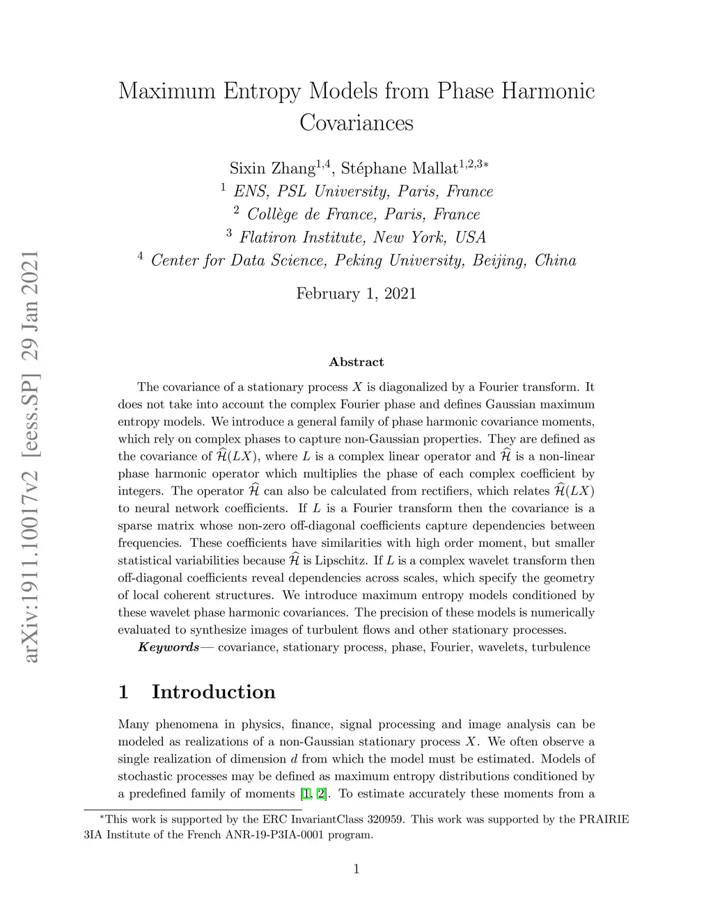 The covariance of a stationary process is diagonalized by a Fourier transform. It does not take into account the complex Fourier phase and defines Gaussian maximum entropy models. We introduce a general family of phase harmonic covariance moments, which rely on complex phases to capture non-Gaussian properties. They are defined as the covariance of , where is a complex linear operator and $\hat{H} $ is a non-linear phase harmonic operator which multiplies the phase of each complex coefficient by integers. The operator can also be calculated from rectifiers, which relates to neural network coefficients. If is a Fourier transform then the covariance is a sparse matrix whose non-zero off-diagonal coefficients capture dependencies between frequencies. These coefficients have similarities with high order moment, but smaller statistical variabilities because is Lipschitz. If is a complex wavelet transform then off-diagonal coefficients reveal dependencies across scales, which specify the geometry of local coherent structures. We introduce maximum entropy models conditioned by these wavelet phase harmonic covariances. The precision of these models is numerically evaluated to synthesize images of turbulent flows and other stationary processes.