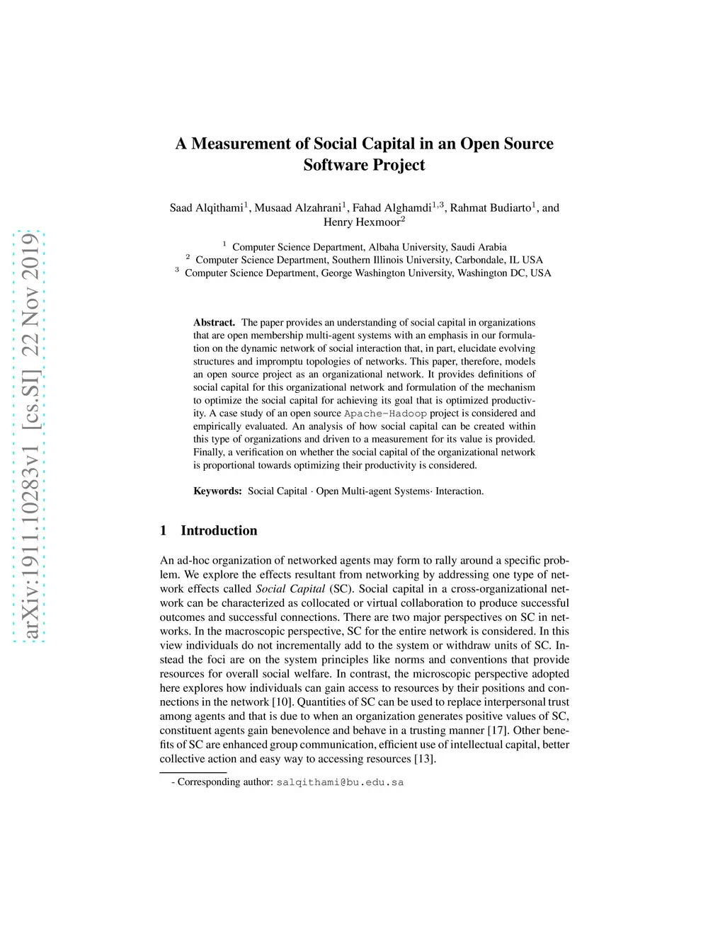 The paper provides an understanding of social capital in organizations that are open membership multi-agent systems with an emphasis in our formulation on the dynamic network of social interaction that, in part, elucidate evolving structures and impromptu topologies of networks. This paper, therefore, models an open source project as an organizational network. It provides definitions of social capital for this organizational network and formulation of the mechanism to optimize the social capital for achieving its goal that is optimized productivity. A case study of an open source Apache-Hadoop project is considered and empirically evaluated. An analysis of how social capital can be created within this type of organizations and driven to a measurement for its value is provided. Finally, a verification on whether the social capital of the organizational network is proportional towards optimizing their productivity is considered.