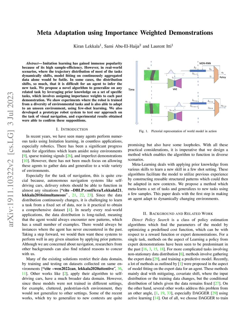 Imitation learning has gained immense popularity because of its high sample-efficiency. However, in real-world scenarios, where the trajectory distribution of most of the tasks dynamically shifts, model fitting on continuously aggregated data alone would be futile. In some cases, the distribution shifts, so much, that it is difficult for an agent to infer the new task. We propose a novel algorithm to generalize on any related task by leveraging prior knowledge on a set of specific tasks, which involves assigning importance weights to each past demonstration. We show experiments where the robot is trained from a diversity of environmental tasks and is also able to adapt to an unseen environment, using few-shot learning. We also developed a prototype robot system to test our approach on the task of visual navigation, and experimental results obtained were able to confirm these suppositions.