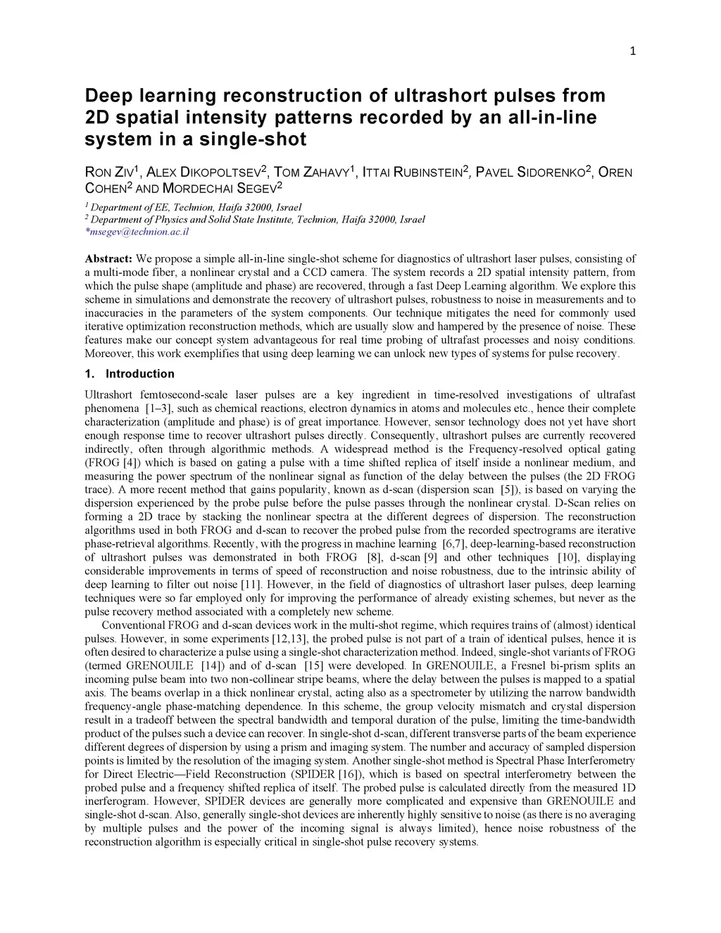 We propose a simple all-in-line single-shot scheme for diagnostics of ultrashort laser pulses, consisting of a multi-mode fiber, a nonlinear crystal and a CCD camera. The system records a 2D spatial intensity pattern, from which the pulse shape (amplitude and phase) are recovered, through a fast Deep Learning algorithm. We explore this scheme in simulations and demonstrate the recovery of ultrashort pulses, robustness to noise in measurements and to inaccuracies in the parameters of the system components. Our technique mitigates the need for commonly used iterative optimization reconstruction methods, which are usually slow and hampered by the presence of noise. These features make our concept system advantageous for real time probing of ultrafast processes and noisy conditions. Moreover, this work exemplifies that using deep learning we can unlock new types of systems for pulse recovery.