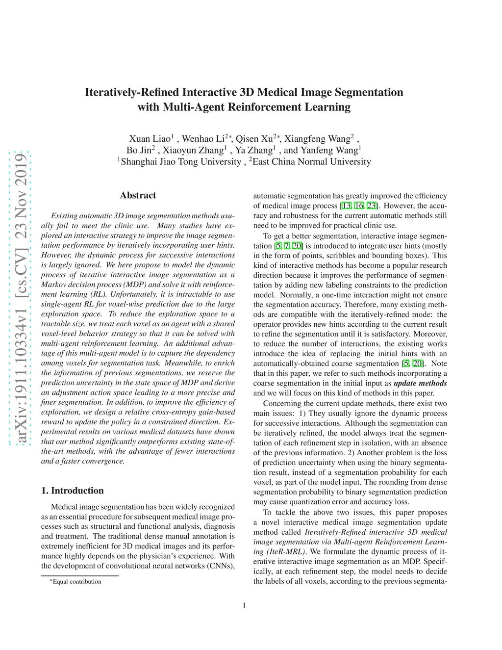 Existing automatic 3D image segmentation methods usually fail to meet the clinic use. Many studies have explored an interactive strategy to improve the image segmentation performance by iteratively incorporating user hints. However, the dynamic process for successive interactions is largely ignored. We here propose to model the dynamic process of iterative interactive image segmentation as a Markov decision process (MDP) and solve it with reinforcement learning (RL). Unfortunately, it is intractable to use single-agent RL for voxel-wise prediction due to the large exploration space. To reduce the exploration space to a tractable size, we treat each voxel as an agent with a shared voxel-level behavior strategy so that it can be solved with multi-agent reinforcement learning. An additional advantage of this multi-agent model is to capture the dependency among voxels for segmentation task. Meanwhile, to enrich the information of previous segmentations, we reserve the prediction uncertainty in the state space of MDP and derive an adjustment action space leading to a more precise and finer segmentation. In addition, to improve the efficiency of exploration, we design a relative cross-entropy gain-based reward to update the policy in a constrained direction. Experimental results on various medical datasets have shown that our method significantly outperforms existing state-of-the-art methods, with the advantage of fewer interactions and a faster convergence.